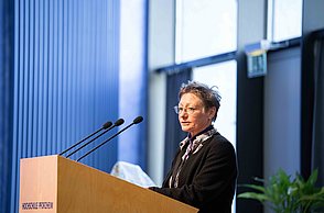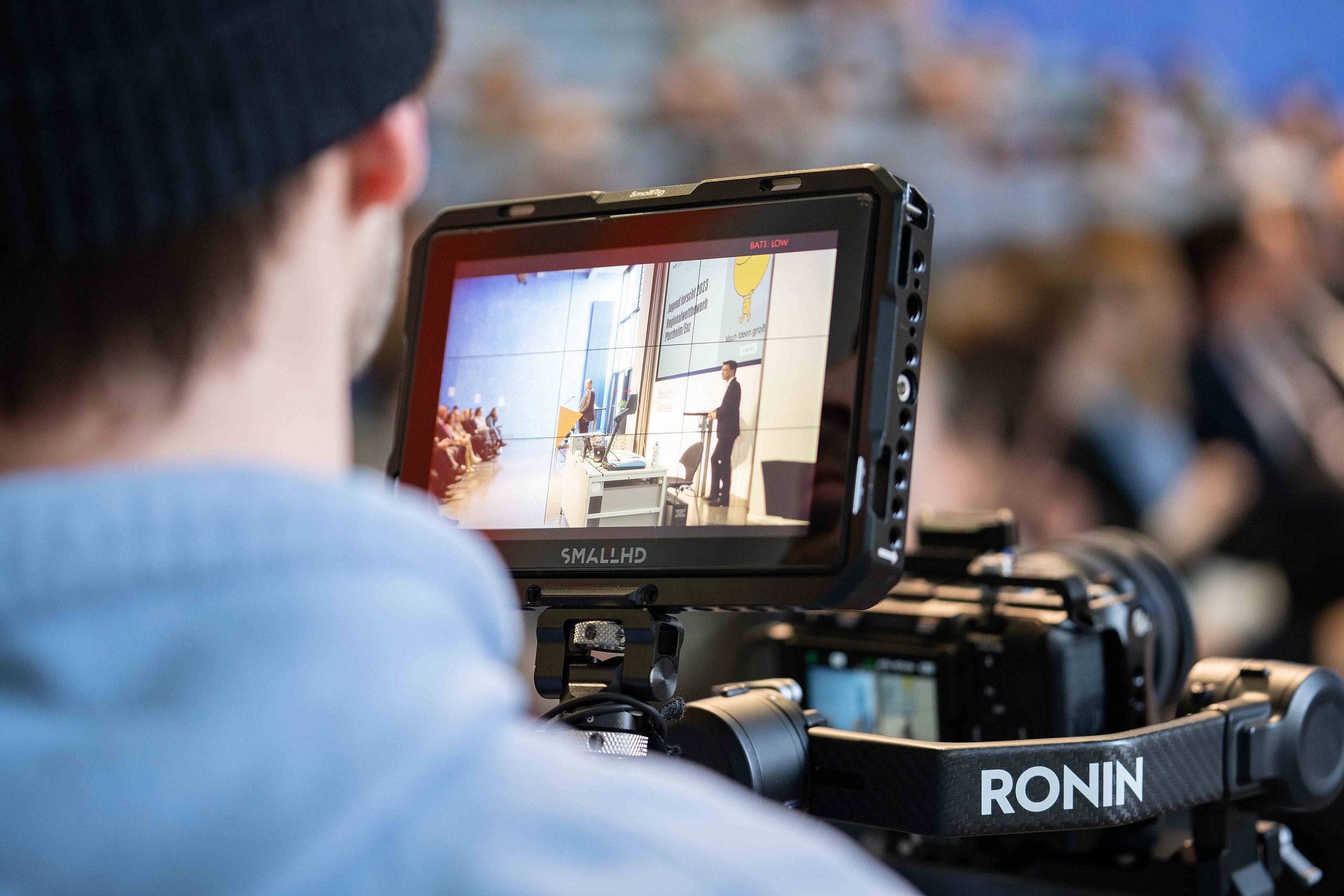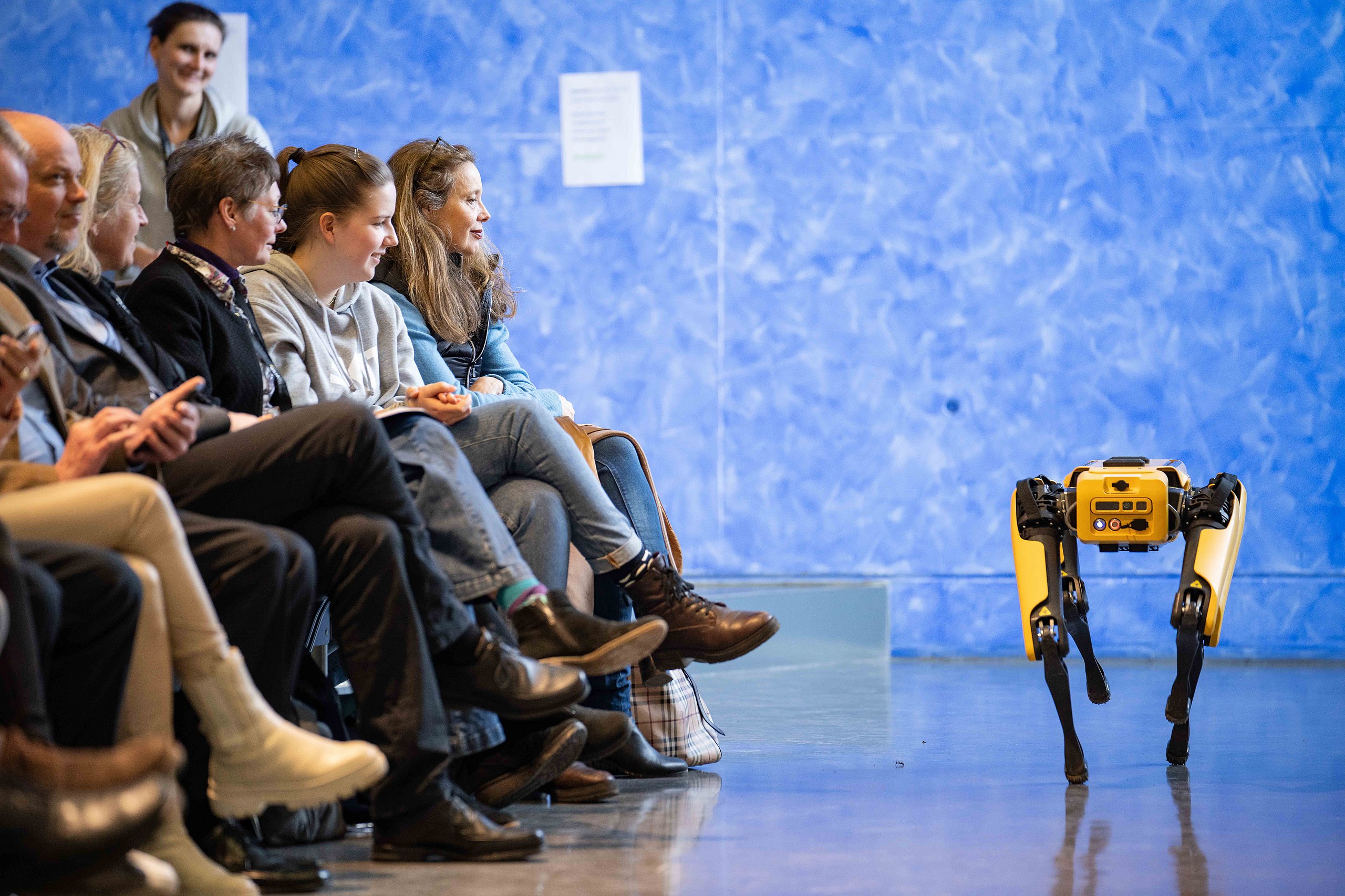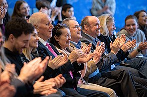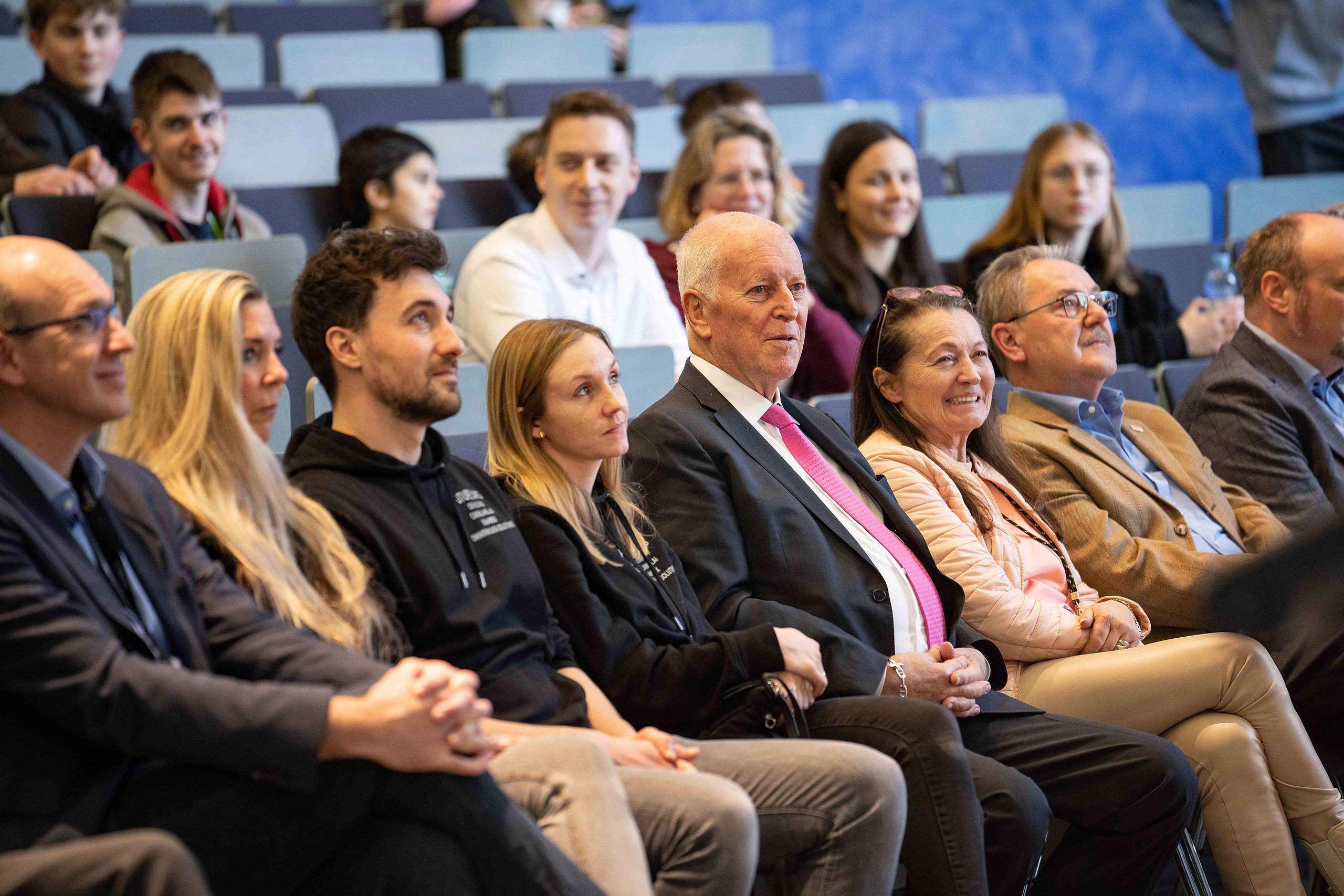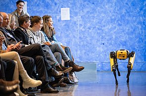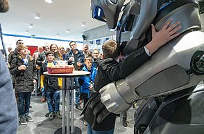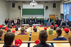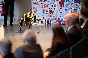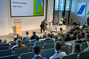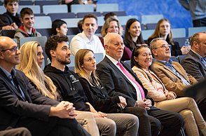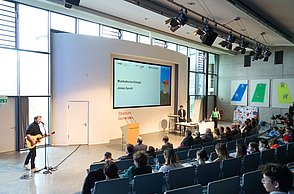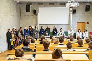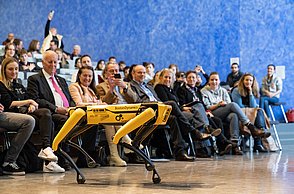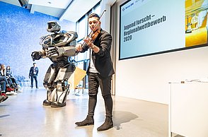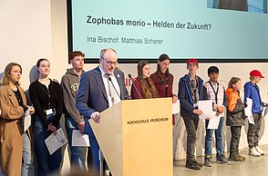 Bei der feierlichen Preisverleihung am Freitagmittag im Audimax der Hochschule Pforzheim waren unter den rund 200 Gästen neben Vertreterinnen und Vertretern der Politik und Wirtschaft auch Familienmitglieder der Jungforscherinnen und Jungforscher. Für Unterhaltung sorgten hier der Pforzheimer Singer und Songwriter Jonas Gavriil sowie der hochschuleigene Roboter „Spot“. Wettbewerbsleiterin Vera Feldmann und Markus Epple, Geschäftsbereichsleiter der Wirtschaftsförderung, würdigten nicht nur das große Engagement der Teilnehmerinnen und Teilnehmer sowie der Projektbetreuerinnen und Projektbetreuer, sondern auch die regionalen Unterstützer, die zur Finanzierung des Nachwuchswettbewerbs beitrugen. Zu Ehren der Jungforscherinnen und Jungforscher hielt Professor Dr.-Ing. Frank Niemann von der Hochschule Pforzheim eine Laudatio. Der Wettbewerb endete mit einem festlichen Empfang, bei dem die Teilnehmenden, Eltern, Lehrerinnen und Lehrer sowie Unterstützerinnen und Unterstützer die Gelegenheit hatten, sich auszutauschen und zu vernetzen.