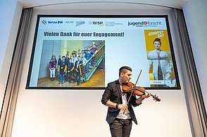 Die feierliche Preisverleihung fand am Freitagmittag im Audimax der Hochschule Pforzheim statt und lockte rund 200 Gäste an. Neben Familienmitgliedern der Teilnehmenden waren auch Vertreterinnen und Vertreter aus Politik, Wirtschaft und Wissenschaft anwesend. Für ein abwechslungsreiches Unterhaltungsprogramm sorgte der Nachwuchsgeiger Noah Leonne aus Pforzheim, der mit seiner einzigartigen und virtuosen Spieltechnik begeisterte. Wettbewerbsleiterin Vera Feldmann und Markus Epple, Geschäftsbereichsleiter der Wirtschaftsförderung, würdigten die hervorragenden Leistungen der Teilnehmenden sowie das Engagement der Betreuenden und Unterstützenden. In seiner Laudatio hob Professor Dr.-Ing. Frank Niemann von der Hochschule Pforzheim die Bedeutung von Neugier und Kreativität als Motor für Fortschritt hervor. Der Wettbewerb endete mit einem festlichen Empfang, bei dem sich die Teilnehmenden, ihre Familien, Betreuerinnen und Betreuer sowie Unterstützerinnen und Unterstützer austauschen und vernetzen konnten. Der Regionalwettbewerb Pforzheim/Enz hat erneut bewiesen, wie viel Potenzial in der jungen Generation steckt. Die Gewinnerinnen und Gewinner qualifizierten sich für den Landeswettbewerb Baden-Württemberg und wurden gebührend gefeiert – eine Inspirationsquelle für alle, die Wissenschaft und Forschung lieben.