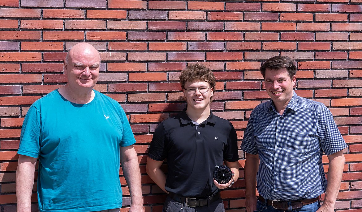 Vadim Soshnyev (Mitte) mit seinem betreuenden Lehrer Dr.-Ing. Joachim Götz (links) und Prof. Dr.-Ing. Alexander Hetznecker (rechts) auf dem Technik-Campus der Hochschule Pforzheim – ein Beispiel gelungener schulischer Nachwuchsförderung durch Hochschulkooperation.
