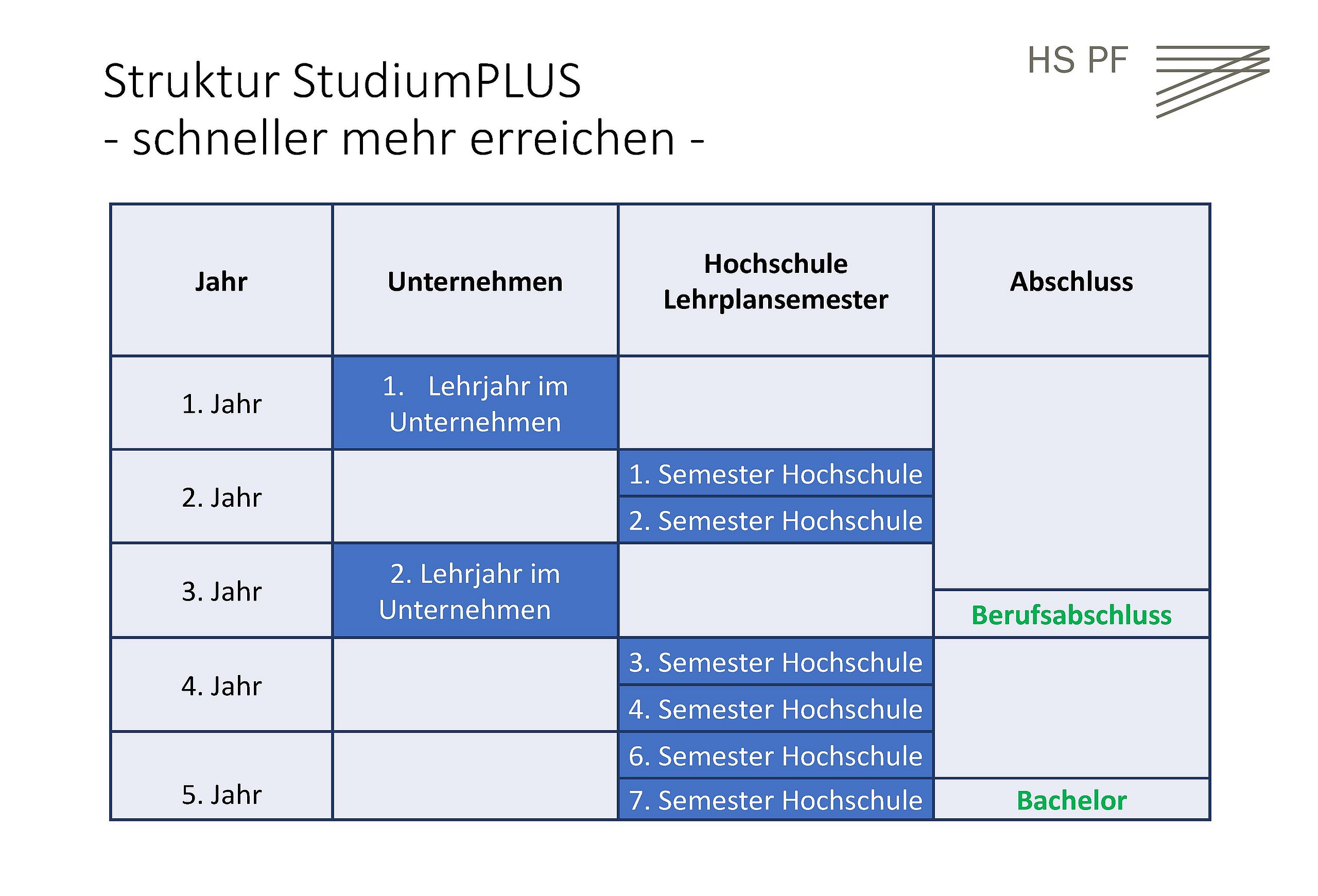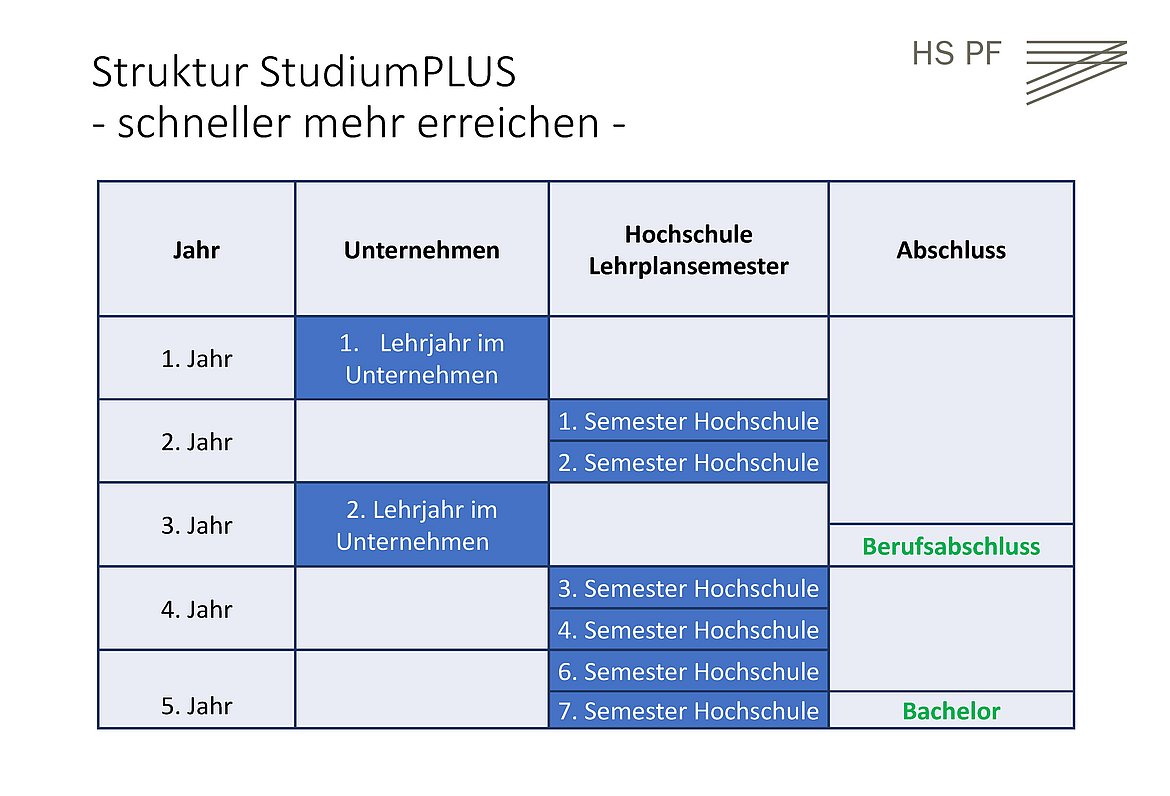 Das Modell StudiumPLUS verbindet praktische Berufsausbildung und Bachelor-Studium in aufeinanderfolgenden zeitlichen Blöcken. Diese Blöcke orientieren sich an den Semesterzeiten. Nach einer einführenden Präsenzphase im Lehrbetrieb von zwölf Monaten erfolgen die ersten beiden Semester an der Hochschule Pforzheim. Nach einer weiteren Präsenzphase im Unternehmen im dritten Ausbildungsjahr, steht im vierten und fünften Ausbildungsjahr das Studium im Fokus. Sämtliche vorlesungsfreie Zeiten verbringen die Programmteilnehmer in ihren Unternehmen – und absolvieren auf diese Weise in mehreren Abschnitten ihr Praxissemester, das im regulären Bachelor-Studium zusammenhängend im fünften Semester erfolgt. Auch die Bachelor-Thesis wird im Ausbildungsbetrieb geschrieben.