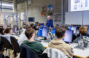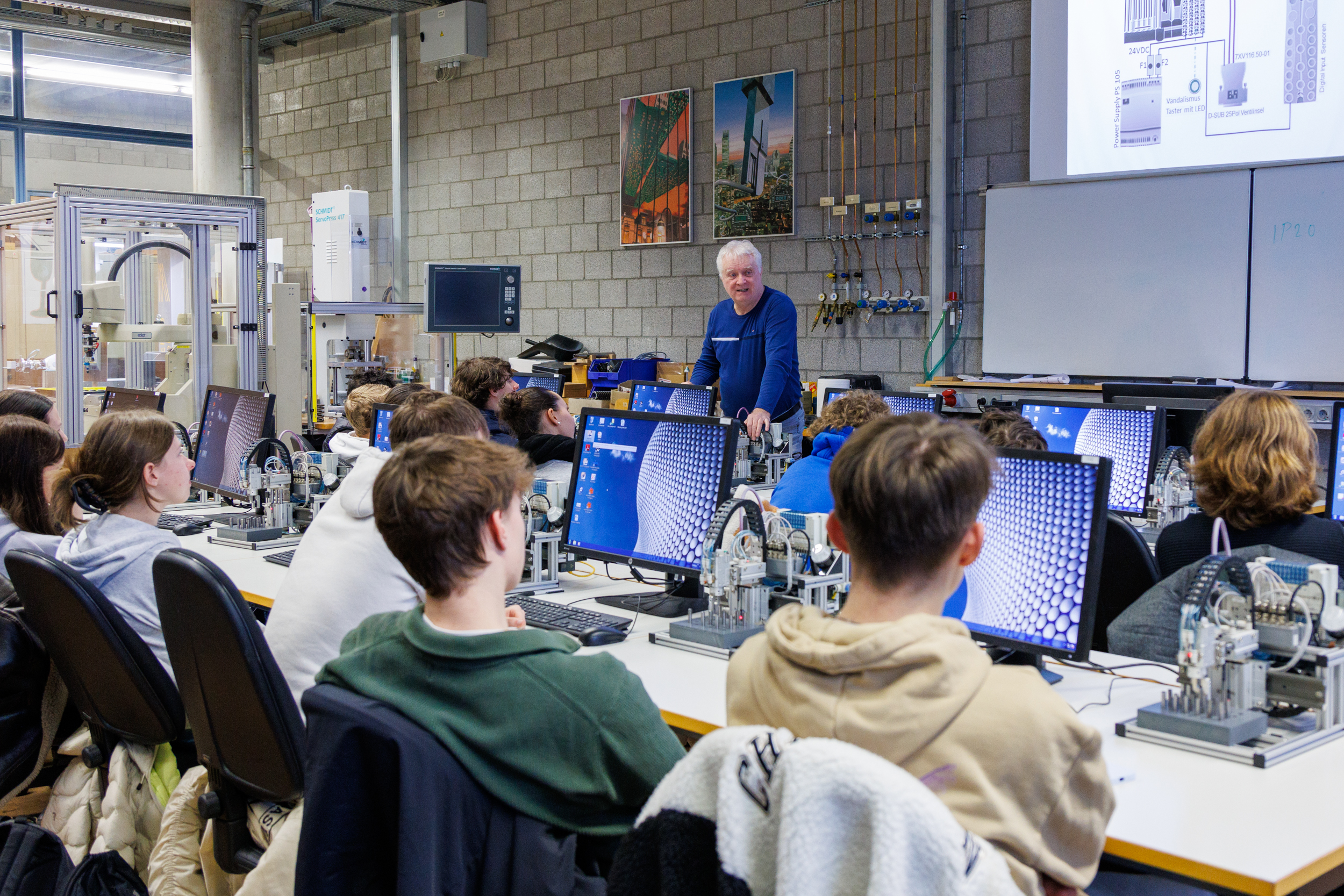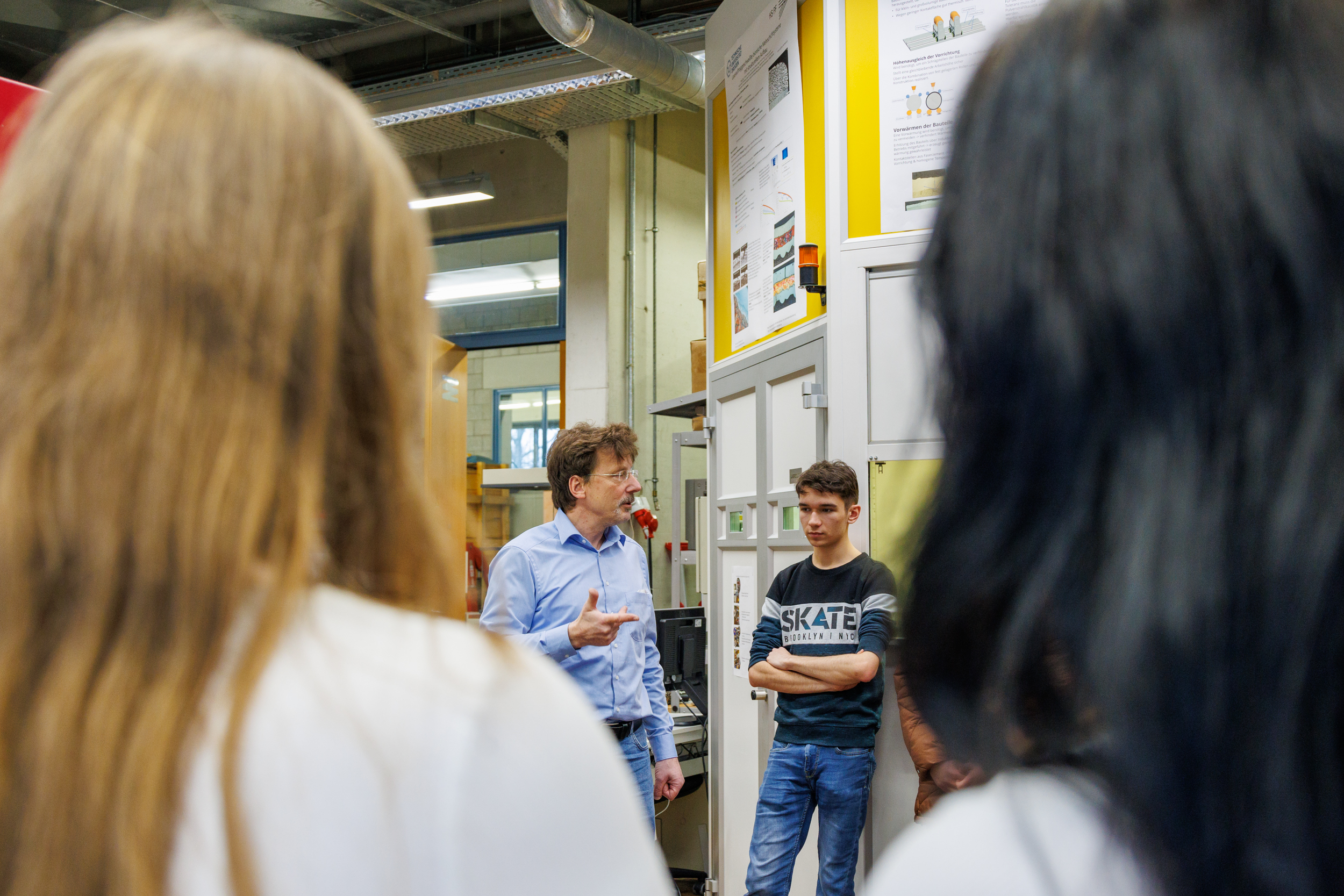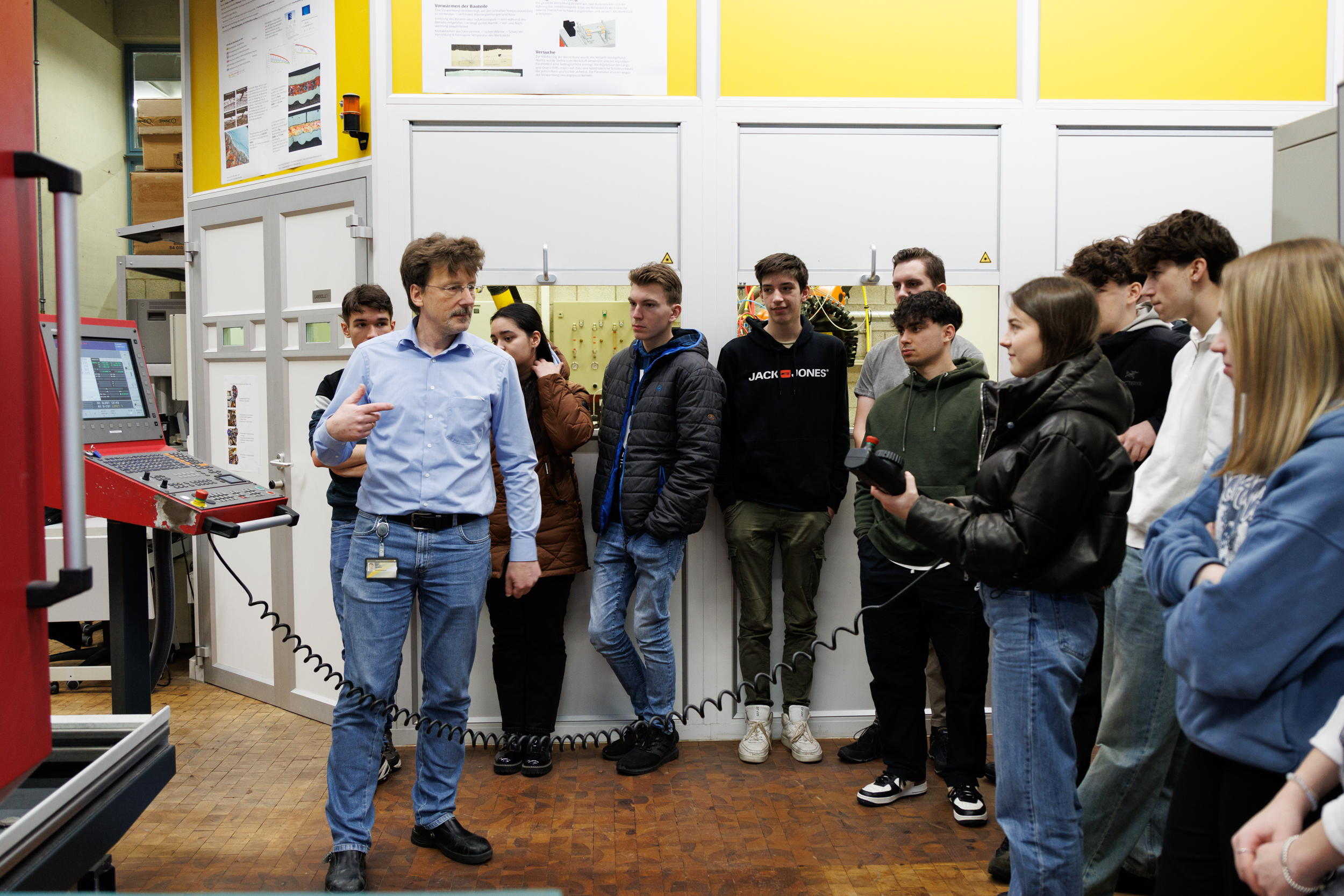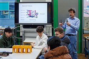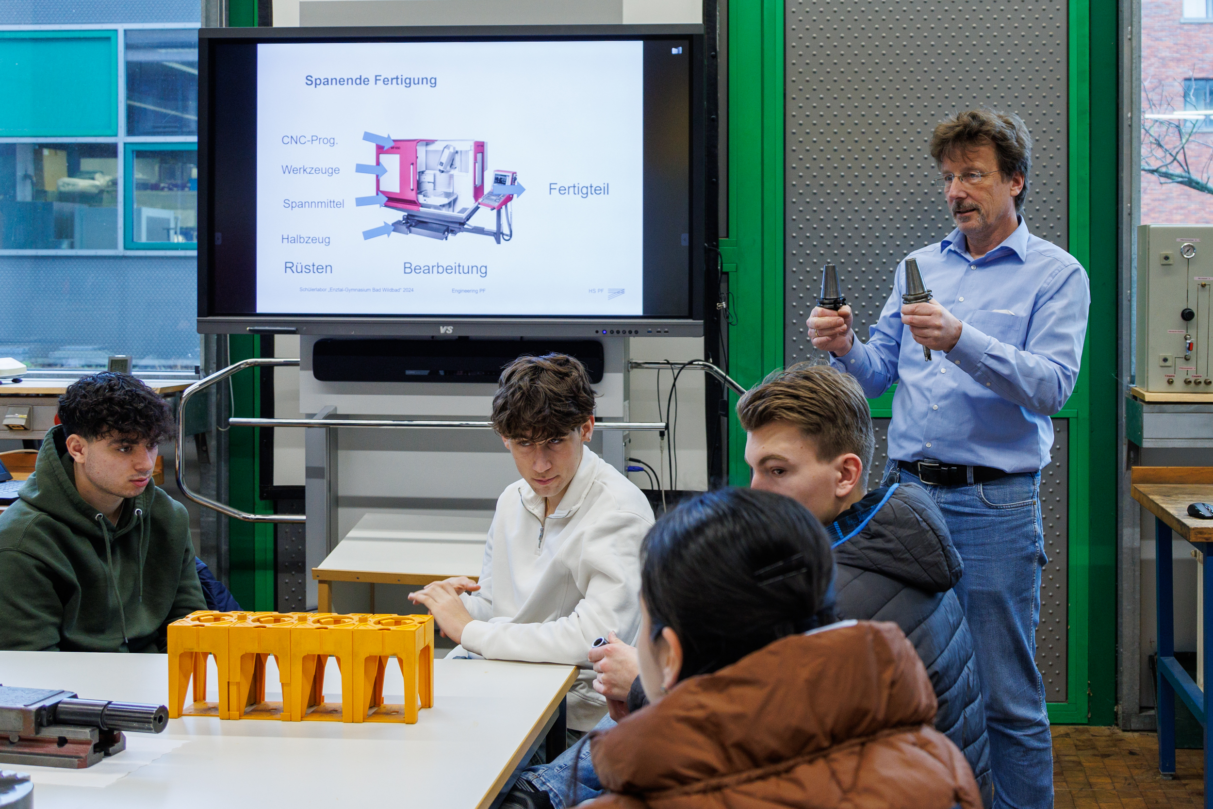 Die Labore fanden unter Anleitung der Laboringenieure Dietmar Eckhardt (CNC-Fräsen) und Konrad Knorrek (SPS) statt. Das Besondere an diesem Format ist die enge Zusammenarbeit und Abstimmung der Inhalte mit den Fachlehrer*innen der Schulen, in diesem Falle Silvan Palige sowie Rüdiger Schmedding.