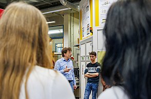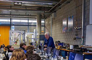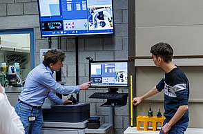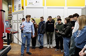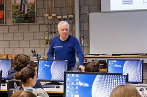 Laboringenieur Dietmar Eckhardt gab im Labor für CNC-Fräsen Einblicke und leitete die Schüler*innen bei praktischen Übungen an. Foto: Susanne Materac/ Hochschule Pforzheim