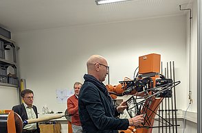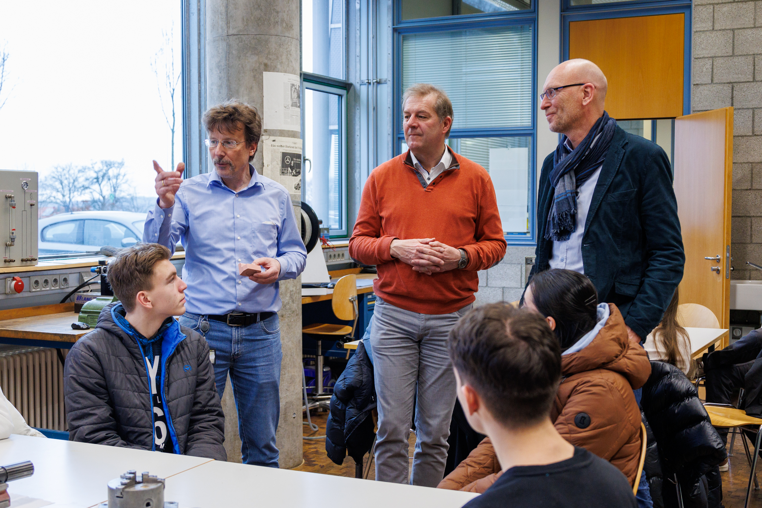 Mit dem von der Karl Schlecht Stiftung geförderten und an der Akademie an der HS Pforzheim angesiedelten Projekt „Schüler*innen Labore“ sollen Gymnasiasten und Gymnasiastinnen der Klassen 10 bis 12/13, vorwiegend mit Naturwissenschaft und Technik -Vertiefung (NwT), bereits vor dem Abschluss Einblicke in ein technisches Studium und die Arbeitsweise von Ingenieur*innen erhalten. „Unsere Absicht ist es, bei jungen Menschen die Begeisterung für die Technik zu wecken und zu vermitteln, was eigentlich Maschinenbau ist und wie Ingenieur*innen arbeiten“, so Projektleiter Professor Jürgen Wrede. Gemeinsam mit Frank Henssler, Senior-Referent Bildung bei der Karl Schlecht Stiftung, machte er sich vor Ort ein Bild über die Laborprojekte.