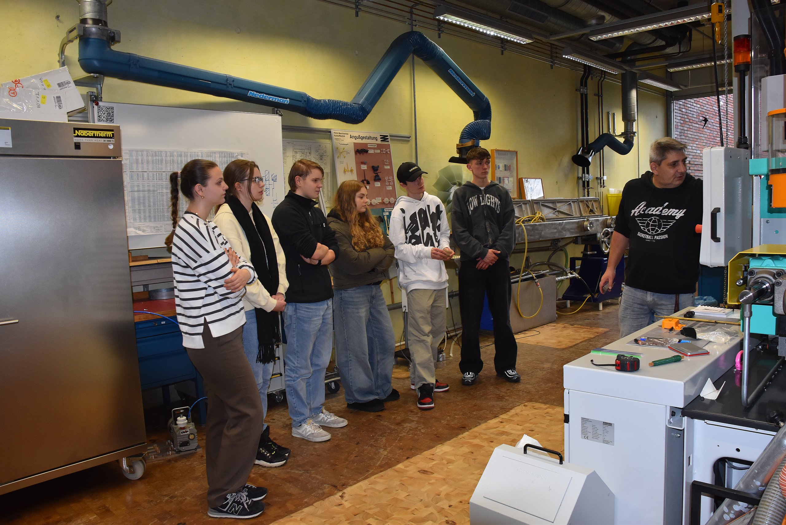 Die Workshops begannen mit je einer Einführung in das Themengebiet, in der das Fertigungsverfahren Spritzgießen und die Bauteilanalyse anschaulich erklärt wurden. Vor den Augen der einen Schüler*innen-Gruppe entstand live und in Farbe ein spritzgegossenes Kunststoffbauteil, während die andere Schüler*innen-Gruppe sich mit den Qualitätsmerkmalen von Bauteilen beschäftigten. In beiden Workshops wurde begreifbar der Fertigungsprozess von Kunststoffbauteilen im Spritzgussverfahren und nicht zuletzt produktions- und qualitätsrelevanter Parameter nähergebracht. Gleichzeitig erfuhren die Schüler*innen wie knifflig die Fertigung dieser Bauteile ist und welche Unwägbarkeiten bei der Fertigung beachtet werden müssen. Sie konnten sich in die Qualitätskontrolle eindenken und Fertigungsproblemen und möglichen Fehlerquellen erkennen.