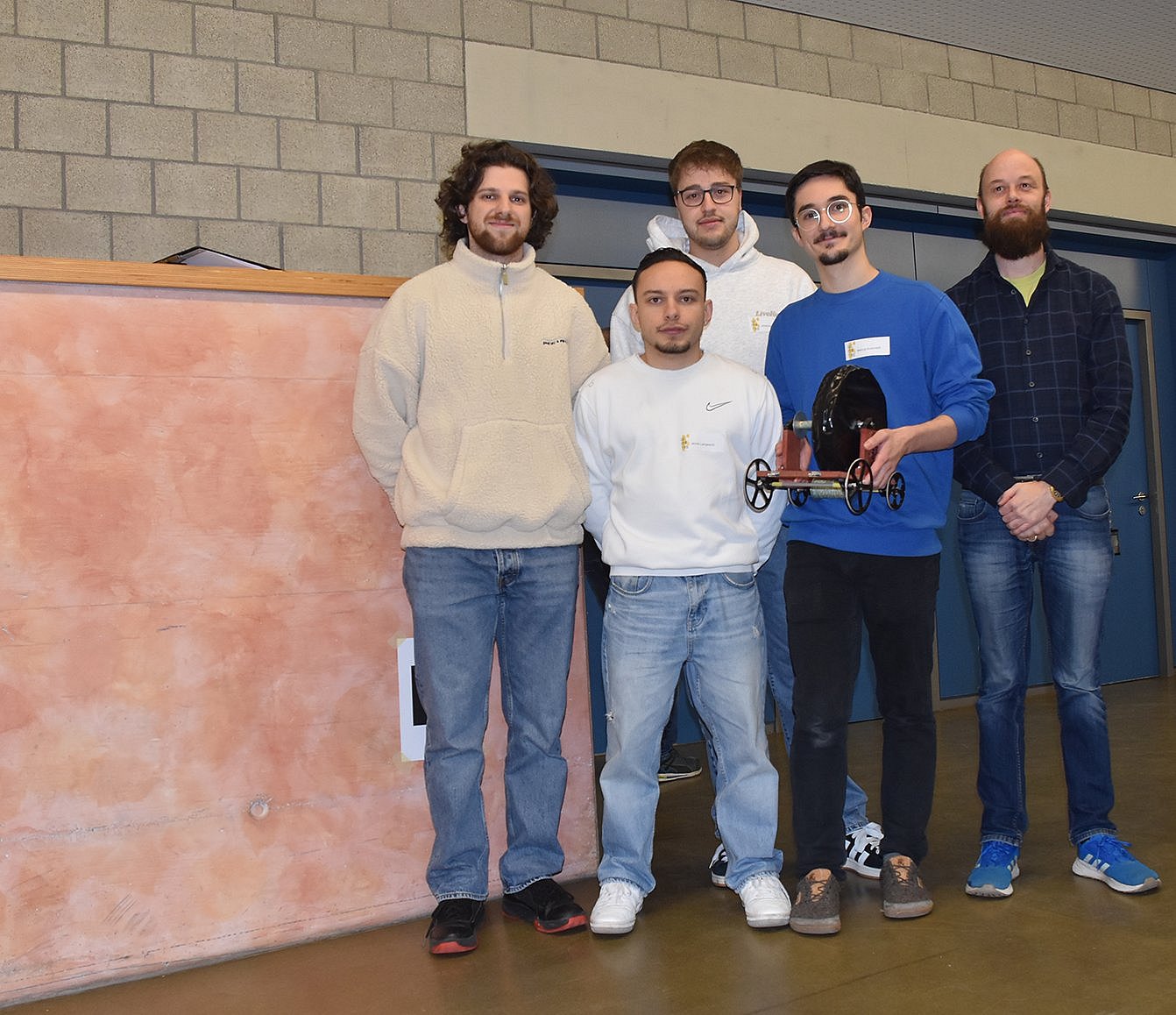 Die Siegergruppe: Fisnik Topalaj; Johannes Aldinger, Jannik Lamprecht, Marcus Autenrieth, Laboringenieur Simon Kött (v.l.). Foto: Heike Marschner-Schulze/HSPF