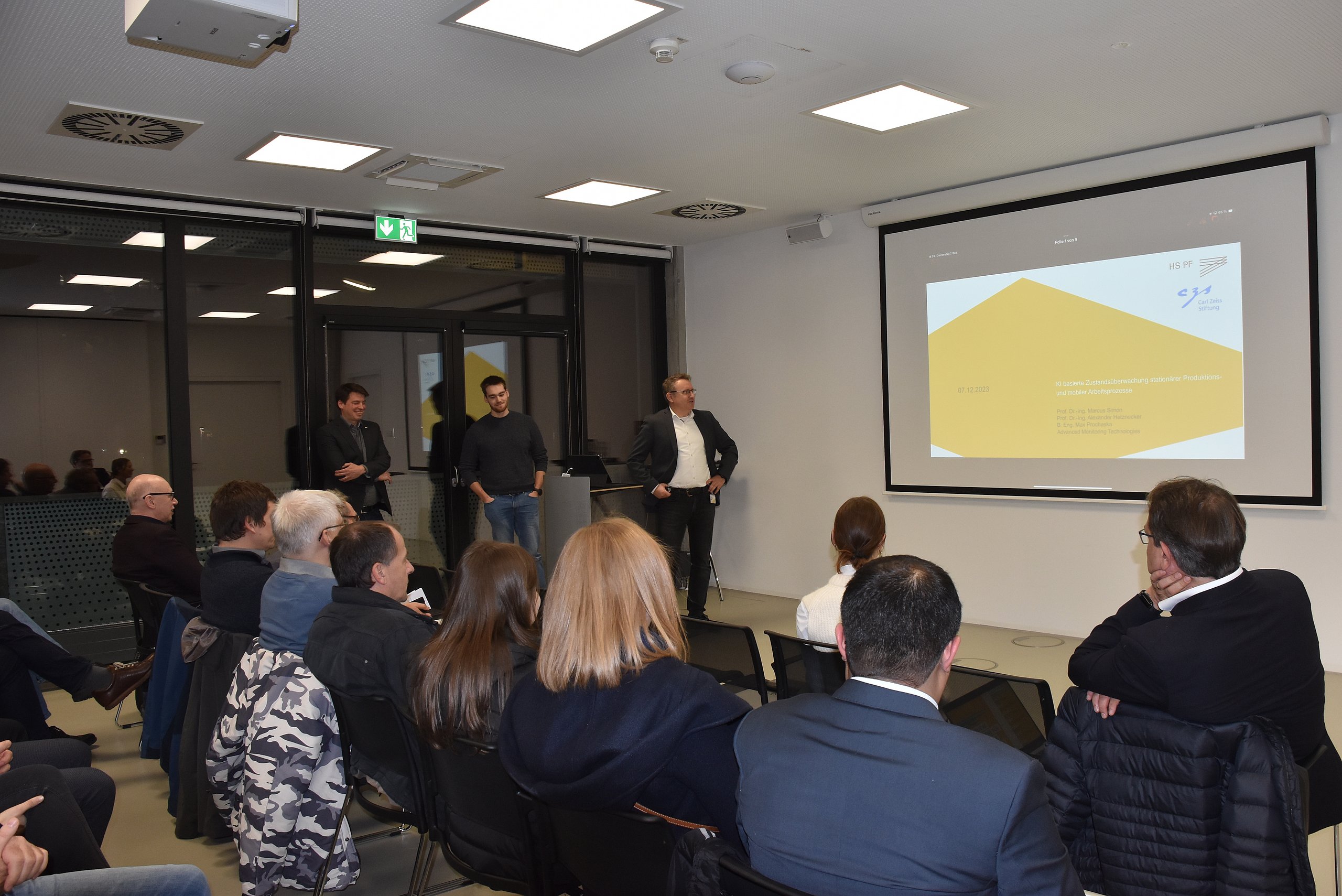 Die Veranstaltungsreihe „Industrie trifft Hochschule“ (ITH) rückte im Rahmen eines Vortragsabends am Donnerstag, 07. Dezember 2023 das Thema „Künstliche Intelligenz für industrielle Anwendungen“ in den Fokus. Im Zentrum für Präzisionstechnik auf dem Campus der Hochschule Pforzheim gab Professor Rainer Drath von der Fakultät für Technik eine kurze Einführung in das Thema, bevor er das Wort an seine Mitreferenten weitergab“.