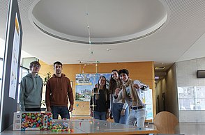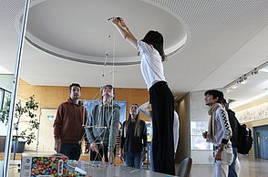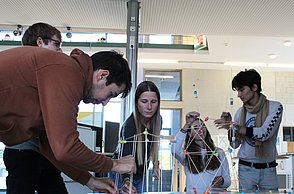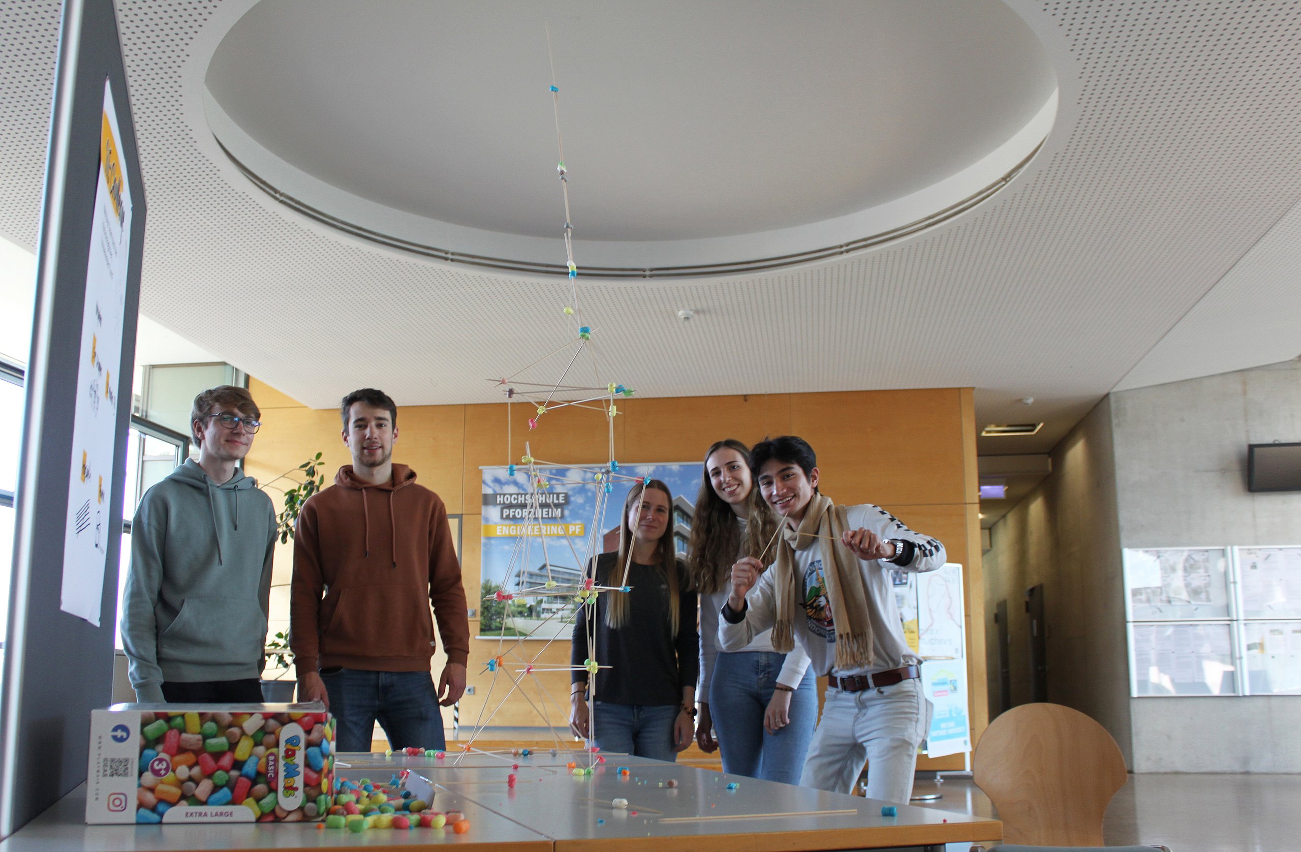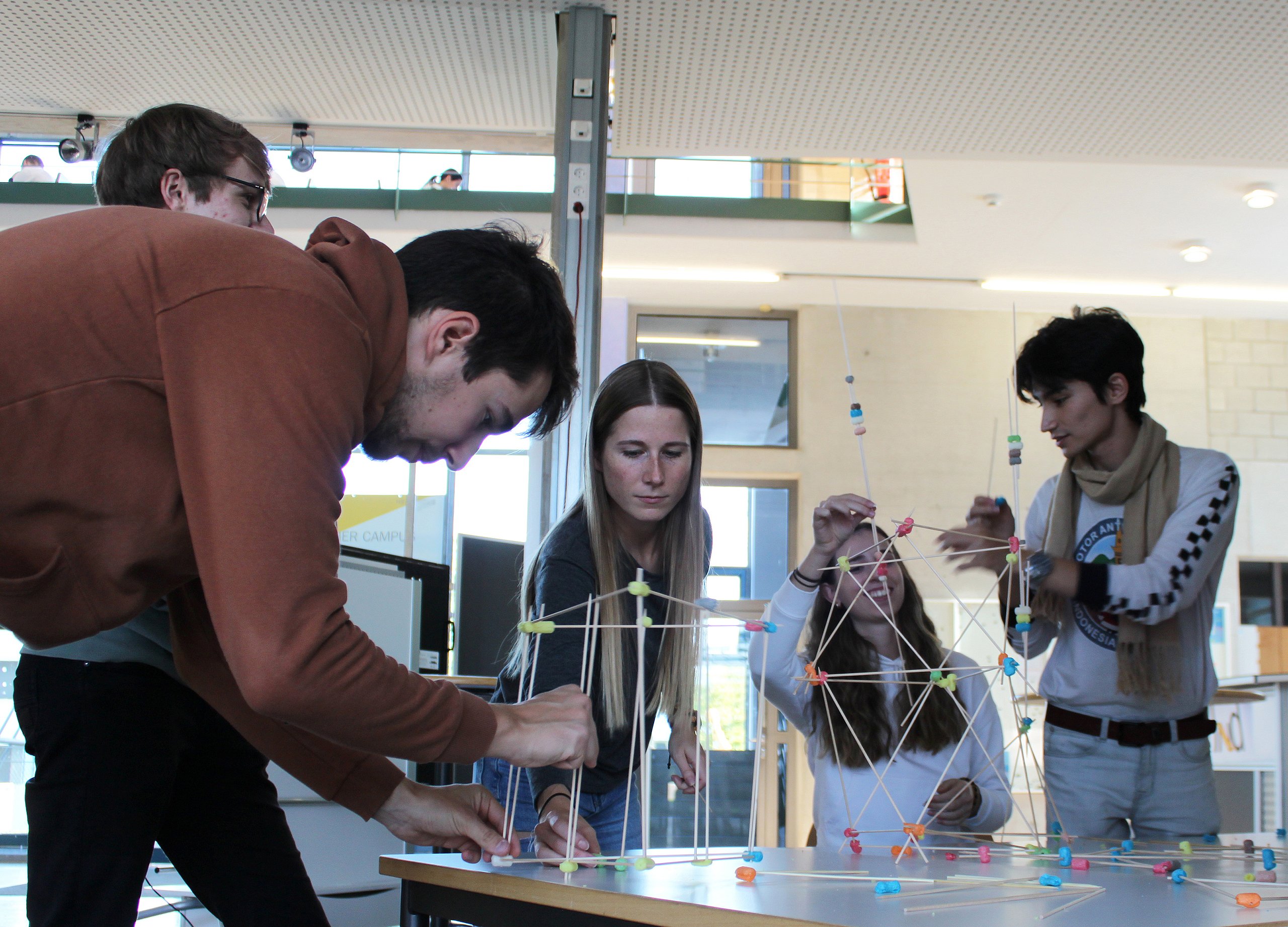 Vom 24. bis 27. Oktober 2022 stand das Foyer des T1-Gebäudes im Zeichen des persönlichen Austauschs. Wieder persönlich miteinander reden: Bachelorstudierende konnten sich mit Professoren- und Mitarbeiterschaft sowie Masterstudierenden spontan austauschen oder sich zu Vier-Augen-Gesprächen verabreden. Voneinander lernen: Im Rahmen einer Ausstellung präsentierten Studierende ihren Kommiliton*innen Arbeiten, die während der Lehrveranstaltung „Methoden und Kreativität“ entstanden waren, wie zum Beispiel eine Miniatur-Rennbahn oder ein Videospiel. Wieder gemeinsam gestalten: Die Turmbau-Challenge rief dazu auf, möglichst hohe Türme zu konstruieren - die Teilnehmer*innen der Gruppe mit der schönsten und stabilsten Konstruktion wurden jeweils mit einem Hochulhoodie beschenkt. Am Mittwoch und Donnerstag schloßen die offenen Angebote im Eingangsbereich jeweils mit Alumni-Vorträgen, es referierten Dennis Treiber, Lukas Weber, Jannick Schmidt und Maximilian Auer. „Unsere Absolventen blickten zurück auf die eigene Studienzeit und berichteten von ihrem Berufseinstieg. Das schafft ein Zusammengehörigkeitsgefühl für unsere jetzigen Studierenden und zeigt ihnen ganz konkrete Perspektiven für ihre Zeit nach dem Hörsaal auf", so Professorin Dr. Viola Galler.