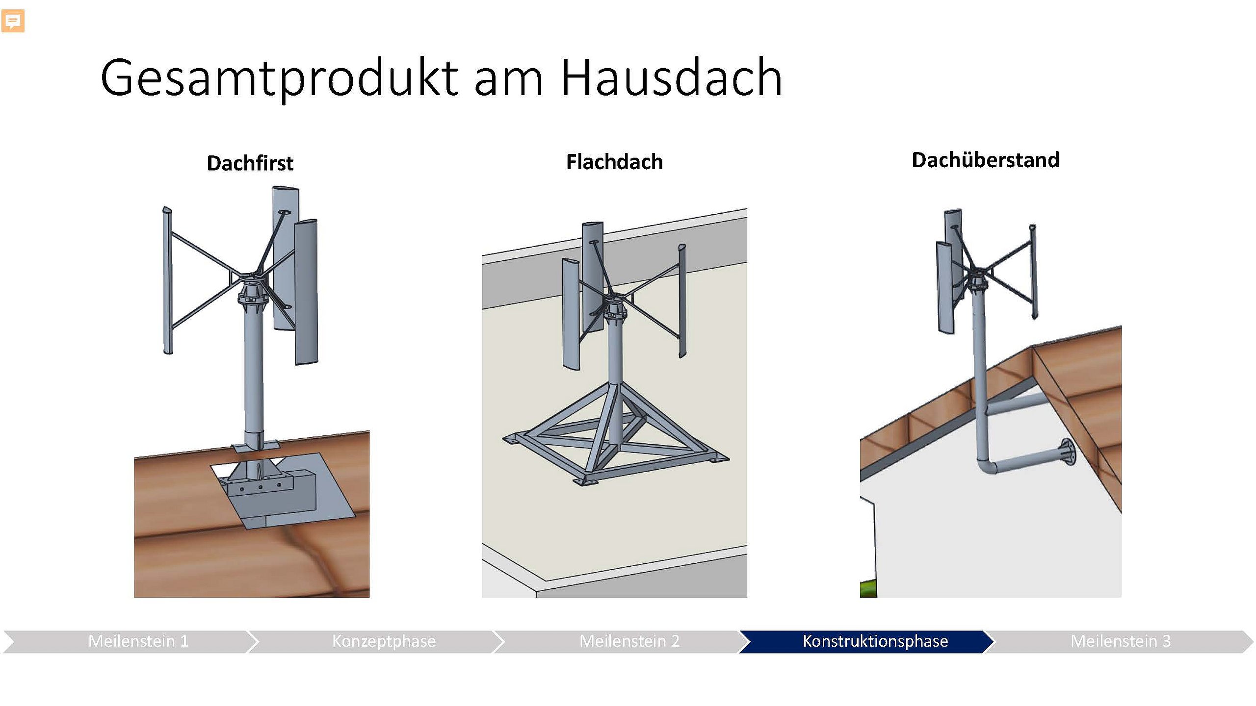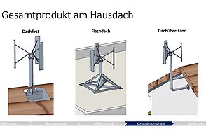 Die Fragestellung, die sich Gruppe 1 gestellt hat lautet: Wie muss die Kleinwindkraftanlage aussehen, damit sie sowohl auf ein Satteldach wie auch auf Flachdach passt? Es gibt verschiedene Bauformen und Arten von Windkraftanlagen, die sich in der Anbringung und Form der Rotorblätter unterschieden. Entschieden haben sich die Jungingenieure*in für ein vertikales Windrad mit drei Rotorblättern. Wichtig dabei war die Schallemission. Gesetzlich vorgeschrieben ist die Einhaltung von 50dB für die Inbetriebnahme tagsüber. Die vorgestellte Konstruktionslösung liegt sogar unter 35bB, damit wäre ein 24stündiger Betrieb gewährleistet. Erarbeitet wurden unterschiedliche Befestigungsmöglichkeiten am Hausdach, einmal für einen Dachfirst, für ein Flachdach und ein System für einen Dachüberstand.