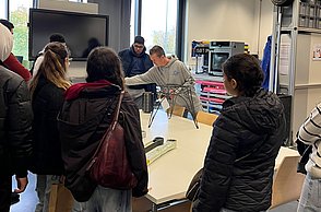 Hier erhielten die Schüler*innen einen praxisnahen Einblick in die vielfältigen Lehr- und Forschungsaktivitäten der Fakultät. Mitarbeitende und Studierende stellten verschiedene Labore und Projekte vor – darunter das Labor für Biomedizinische Analytik, das Labor für Leichtbau, das Labor für Nachhaltige Produktentwicklung sowie die studentische Initiative Rennschmiede. Die Gruppe zeigte großes Interesse an den vorgestellten Themen und nutzte die Gelegenheit, Fragen zu Studieninhalten, Forschungsansätzen und Berufsperspektiven im technischen Bereich zu stellen.