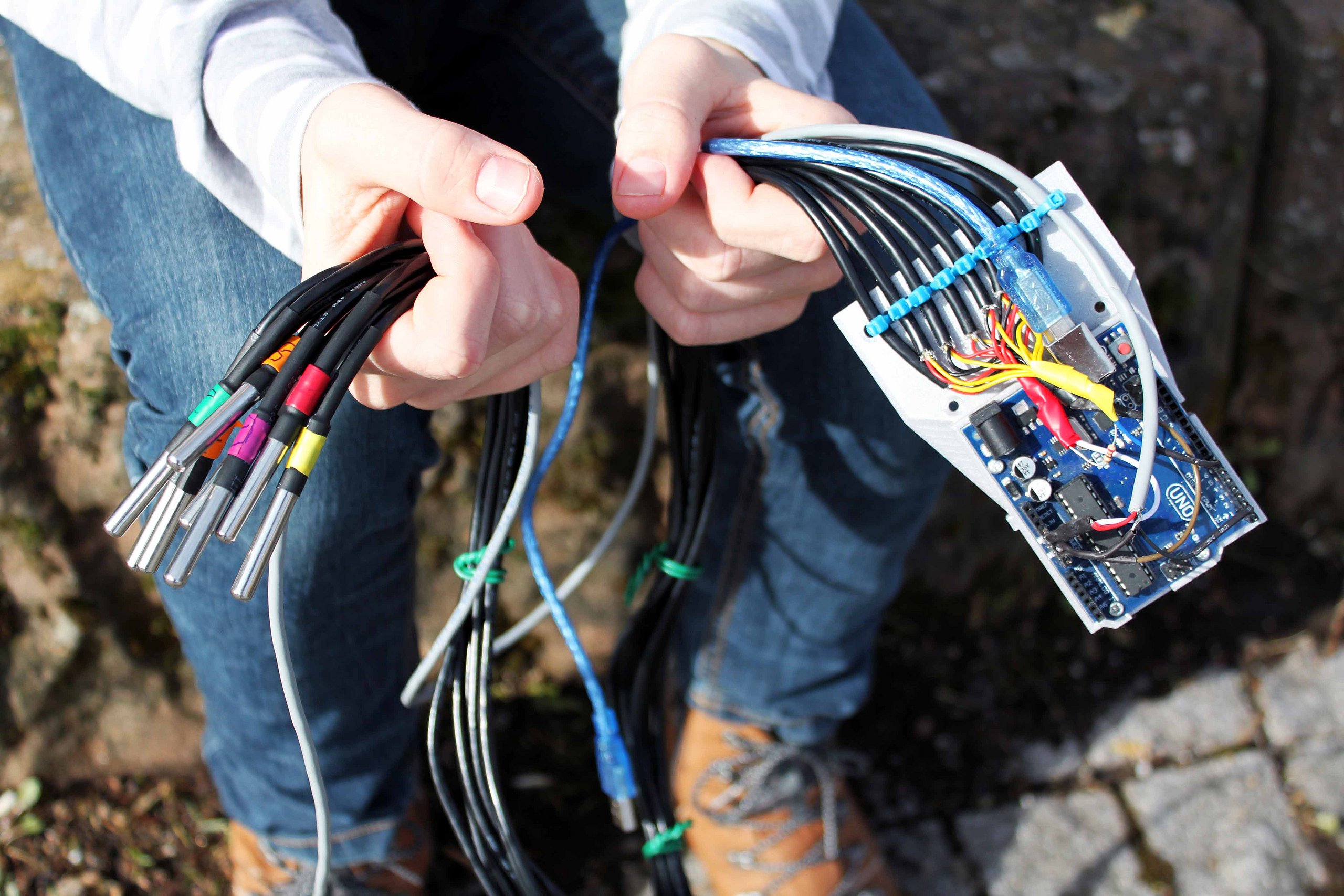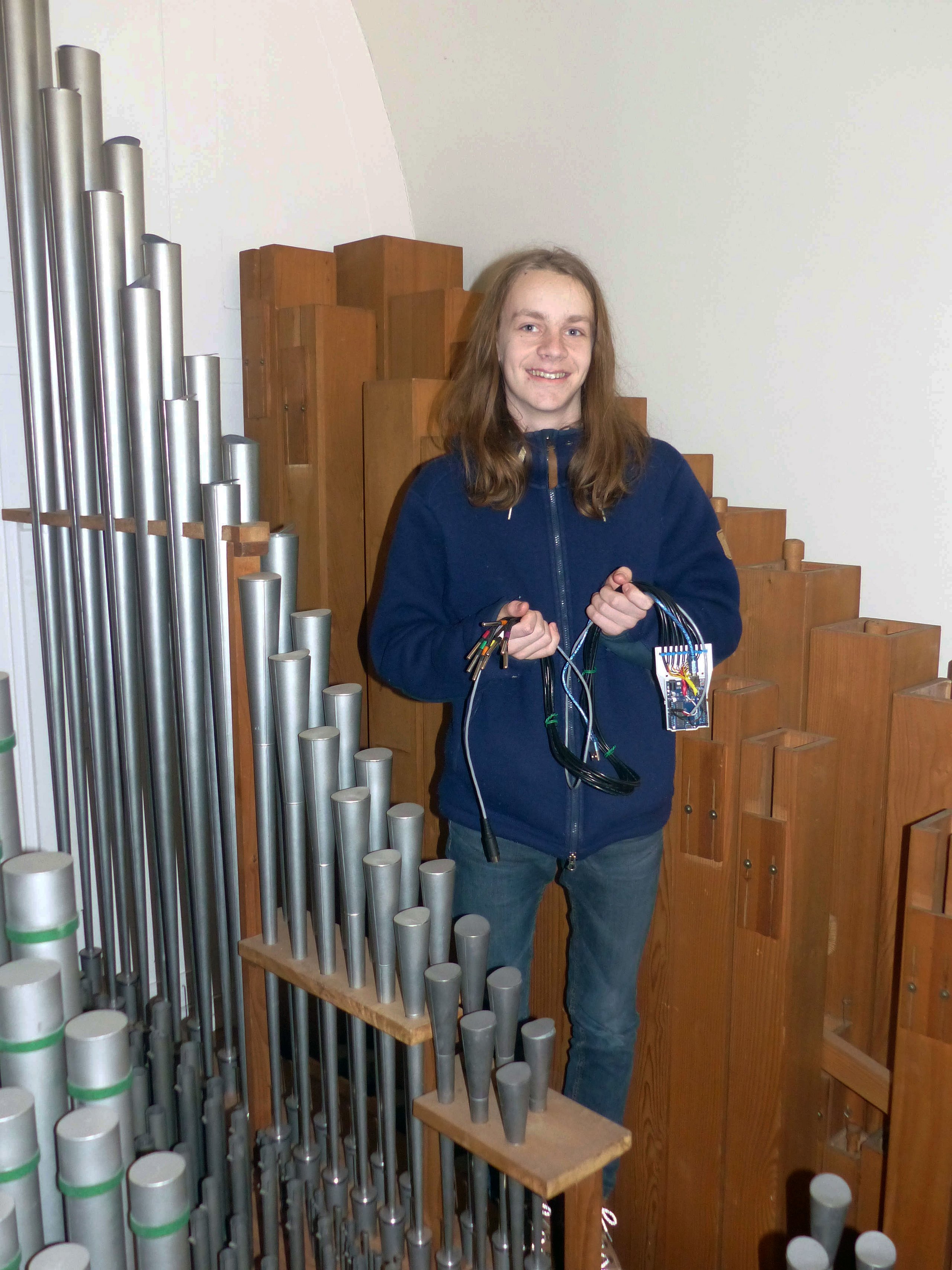 Justus Dicker, schon lange ein begeisterter Elektronikbastler, programmierte dafür einen Mikrocontroller, der über acht Temperaturfühler die Temperatur an den Pfeifen misst, daraus die Schallgeschwindigkeit und einen Korrekturfaktor für die Tonhöhe berechnet und die passenden Steuersignale für die elektronische Klangerzeugung produziert – „so ist die Orgel immer perfekt in sich gestimmt“, freut sich der 15-Jährige. „Die Übertragung der geänderten Tonhöhe an die elektronische Klangerzeugung hat zunächst nicht wie erwartet funktioniert – aber Justus hatte eine pfiffige Idee, wie man das Ziel anders erreichen konnte“, zeigt sich Ulrich Heinen begeistert.