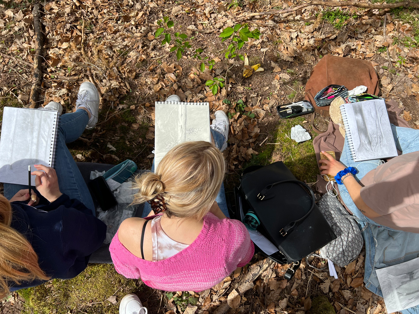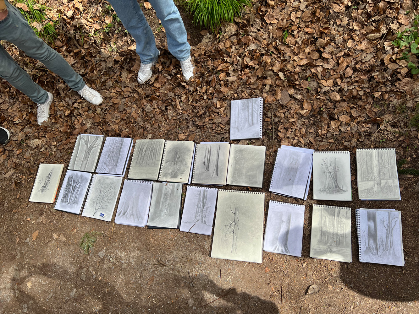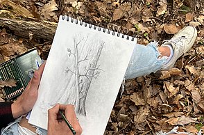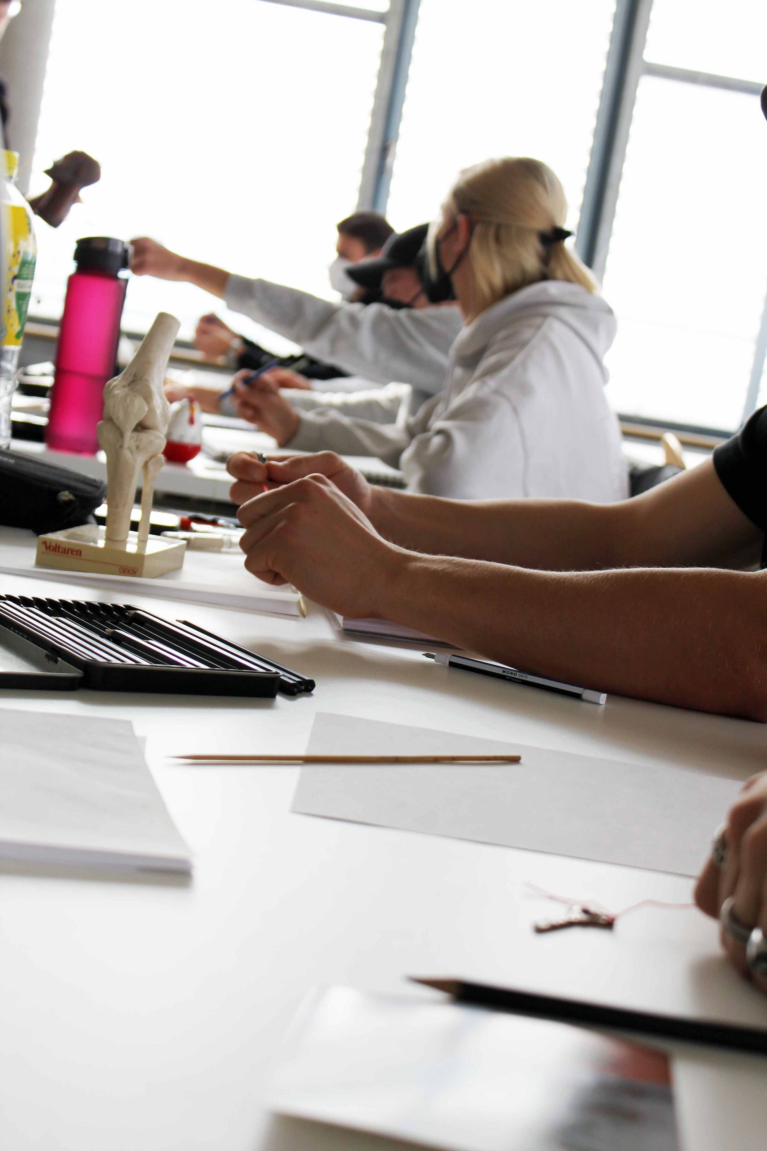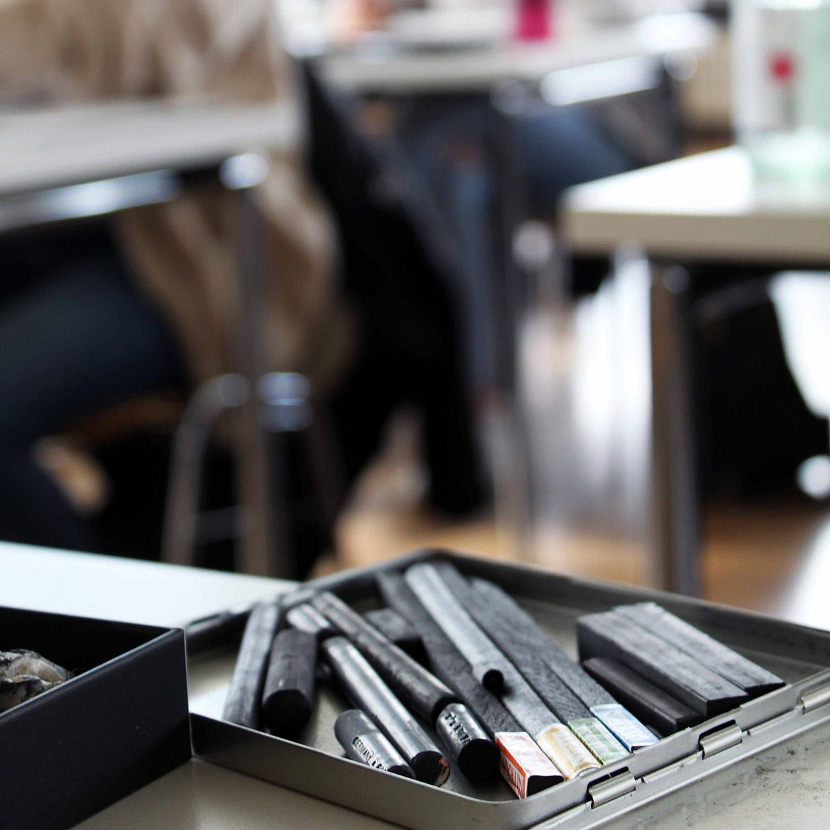 „Zeichnen ist relevant“, ist sich Stephanie Türck sicher. Ihr Zeichenkurs befähigt und ermutigt die Studierenden über die Schulung der Wahrnehmung, akademische Methoden und das freie Experiment zur visuellen Kommunikation eigener Ideen mit dem Stift. Grundlegende Zeichentechniken werden mit Fokus auf Kontur und Form, Licht und Schatten, Proportion, Perspektive und Komposition vermittelt und praktisch erprobt, die Studierenden dabei zu kreativen Lösungsstrategien animiert. Die Unterrichtseinheiten im Freihandzeichnen finden im Hörsaal, auf dem Außengelände der Hochschule und im nahe gelegenen Wald statt.