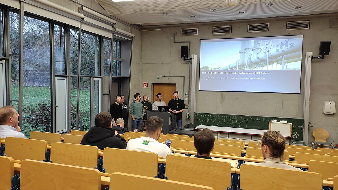Zwei Arbeitsgruppen mit Studierenden der Ingenieurwissenschaften beschäftigten sich mit der Ausarbeitung von zwei unterschiedlichen Technologiekonzepten. Bei Konzept I wurde der erzeugte Wasserstoff direkt vor Ort gespeichert, während bei Konzept II der erzeugte Wasserstoff über eine Pipeline zu einer benachbarten Biogasanlage transportiert und dort in einem sogenannten Sabatier-Prozess zu Bio-Methan verarbeitet und gespeichert wurde. Ein weiterer Bestandteil der Aufgabe war eine abschließende Bewertung mit fundierten Argumenten und Fakten in Bezug auf die technologische Tragfähigkeit des Konzeptes.