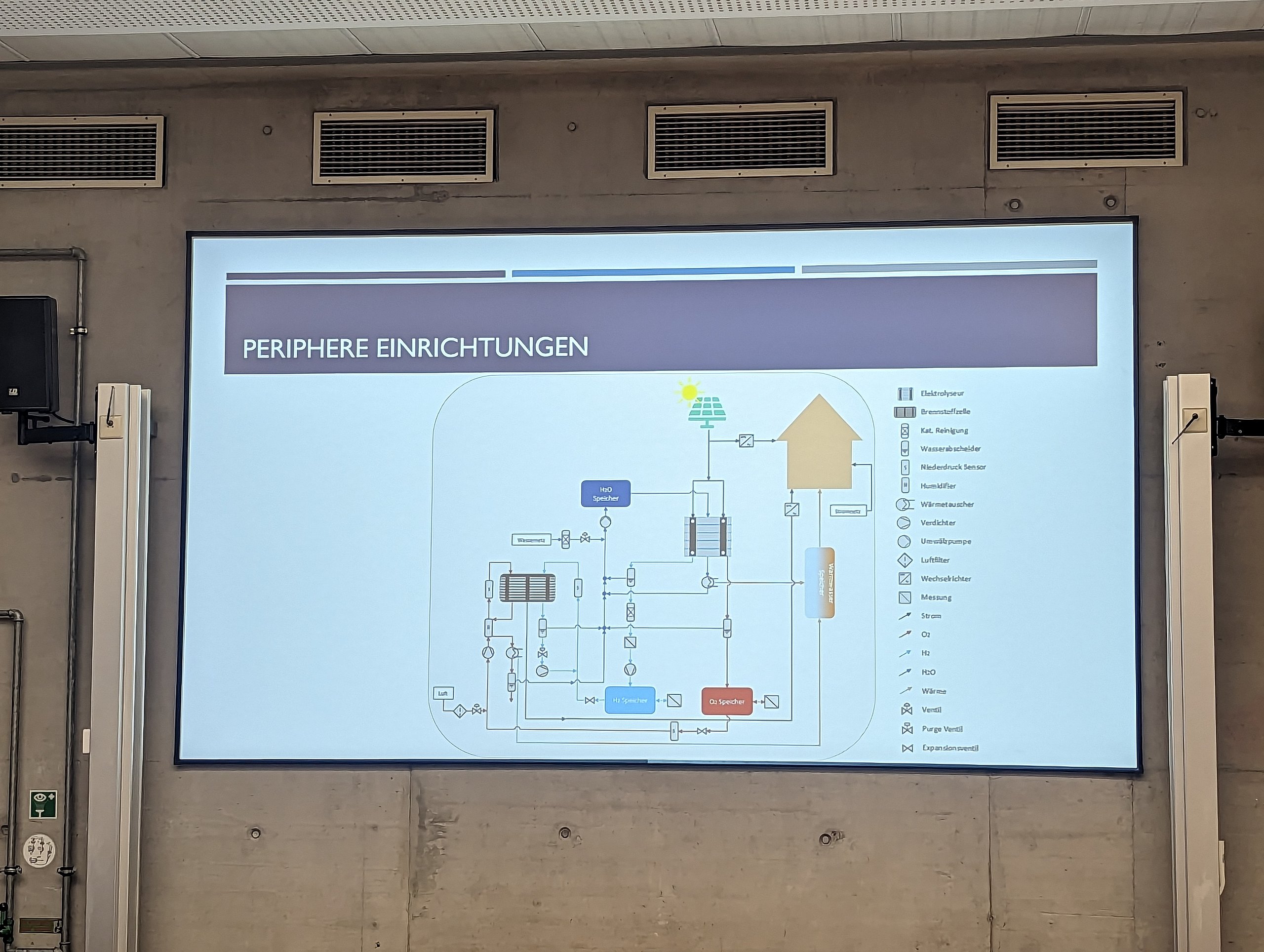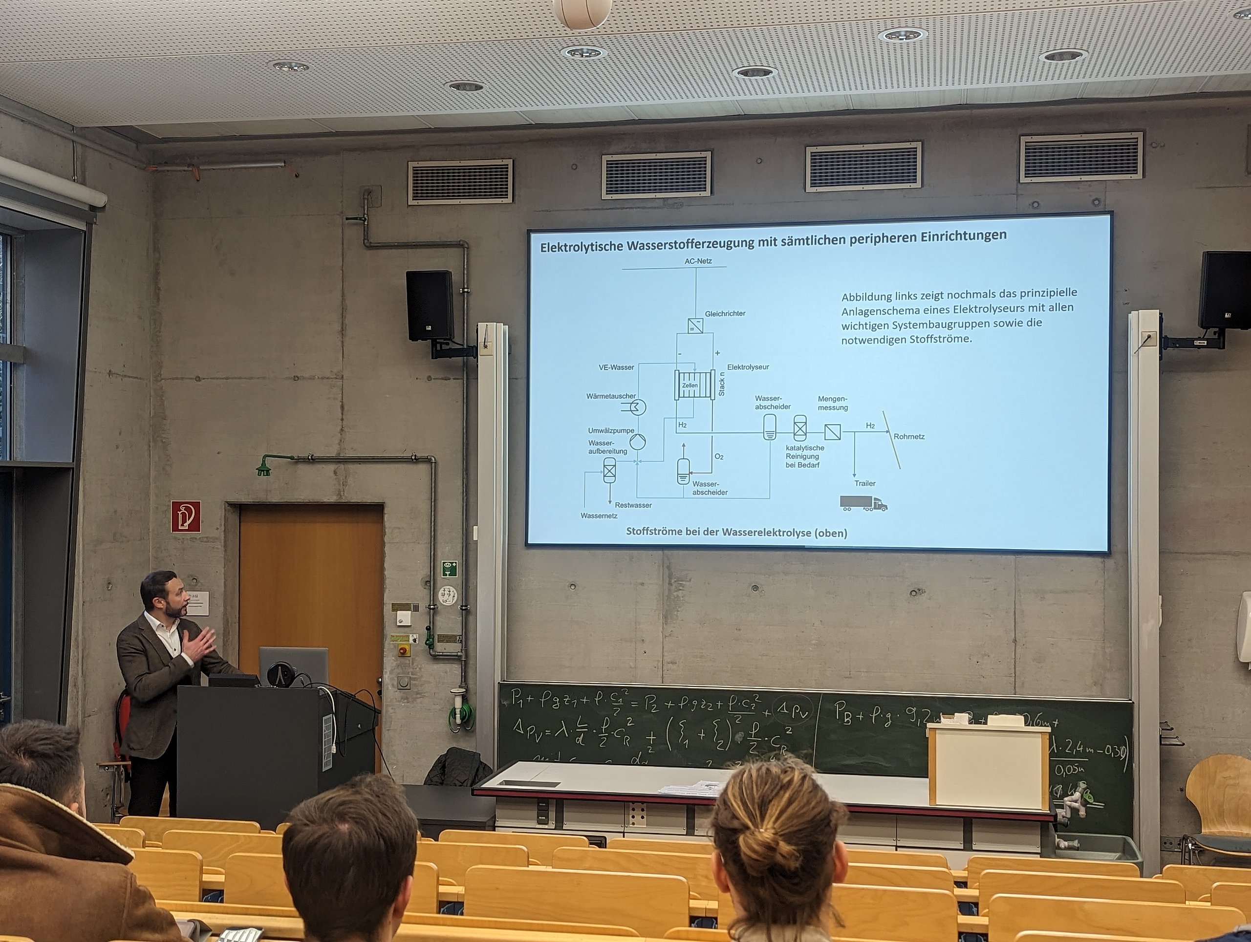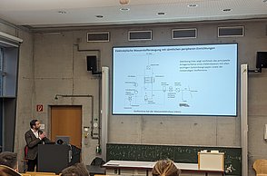 Konkret ging es um eine Neubauwohnsiedlung mit 100 Einfamilienhäusern, die zukünftig vollständig autark mit Strom und Wärme versorgt werden sollte. Es war vorgesehen, dass der Strom über Photovoltaikanlagen erzeugt und der nicht direkt gebrauchte Strom elektrolytisch in Wasserstoff umgewandelt und für einen späteren Bedarf langfristig gespeichert werden sollte. Hinzu kamen noch weitere Randbedingungen, die die Studierenden bei der Auslegung ihres Lösungsvorschlages berücksichtigen mussten.