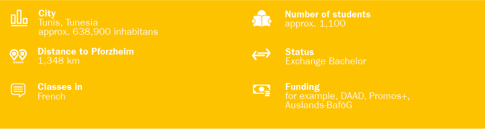 ENIT has excellent international networks with partner universities, including very renowned French institutions, with which ENIT collaborates for several Double Degree Programmes. Since 2017, all ENIT study programmes have been accredited with the EUR-ACE label ("European Accreditation Standard") through the European accreditation agency ASIIN. This certifies that the standard of teaching and research at ENIT meets the European requirements in engineering. The teaching language in the courses is mainly French, i.e. those who go to Tunis for an exchange with ENIT should have a good command of French.