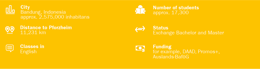 „Da mir die südostasiatische Kultur immer schon sehr gefallen hat, fiel mir die Entscheidung für Bandung leicht. Die relativ niedrigen Lebenskosten in Indonesien waren mitentscheidend. Vom Niveau her ist es am ITB etwas einfacher als in Pforzheim. Aber es muss durchgehend Leistung erbracht werden (Tests, Präsentationen, Mid-terms und Finals), dafür ist die Prüfungsphase viel entspannter. Mein Rat an alle, die ins Ausland gehen: Seid offen für Neues und akzeptiert, was anders ist.“