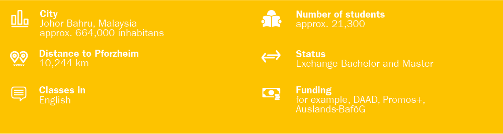 Come to Malaysia and visit UTM in Johor Bahru for a semester abroad. What can you expect in Malaysia? Malaysia is a country of mysterious appeal and charm. As a student at UTM you will not only achieve specific academic outcomes, but also experience tropical flora and fauna, fascinating places of Portuguese, Dutch and British heritage, unique Asian gastronomic experiences, and colorful multi-cultural festivals. Immerse yourself in the diversity of religions such as Islam, Hinduism, Buddhism, Christianity, and Sikhism. What distinguishes our country from others is its reception to various cultures, without losing its own identity. Increase your knowledge and collect memories for life!