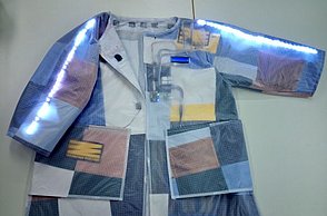 Tippt der Träger eine Textnachricht in sein Smartphone, so erscheint diese auf einem Farbdisplay der Jacke. „Das kann beispielsweise als Namensschild genutzt werden“, erklärt Alexandra Göhring. Außerdem, so die Masterstudentin im Studiengang Produktentwicklung, informiere die Jacke ihren Träger über eingehende Anrufe auf dem Mobiltelefon: „Vibrationsmotoren, die im Nackenbereich eingenäht wurden, informieren hier den Träger.“ Auf einem innenliegenden Display, das mit sogenannten Organic Light Ermitting Dioden (OLED) betrieben wird, werden Name oder Telefonnummer des Anrufers angezeigt.