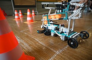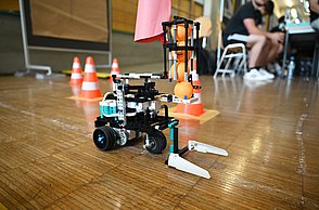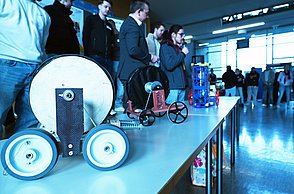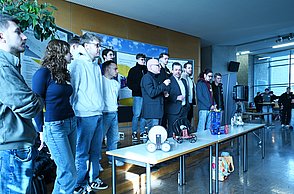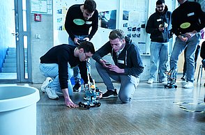 Es war viel los im Foyer der Fakultät für Technik: Studierende des Wirtschaftsingenieurwesens und des Maschinenbaus zeigten zum Ende des Semesters, in welche Projekte nicht nur Credits, sondern auch kreative Ideen und Begeisterung geflossen sind. Da gab es einiges zu sehen für interessierte Besucher*innen, aber auch für die Studierenden unter sich. Es gab zum Beispiel Wettbewerbe mit selbst konstruierten kleinen Fahrzeugen und ausgeklügelten Lego-Robotern, die Tischtennisbälle abgefeuert haben. Ein eigens programmiertes Computerspiel, bei dem man wie Super Mario fröhlich durch das Praxissemester hüpft und eine tolle Ausstellung von künstlerischen Werken aus dem Freihandzeichenkurs. Innovativ, vielseitig, spannend und mit einer spürbaren Portion Herzblut.