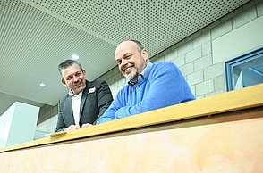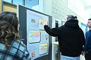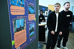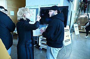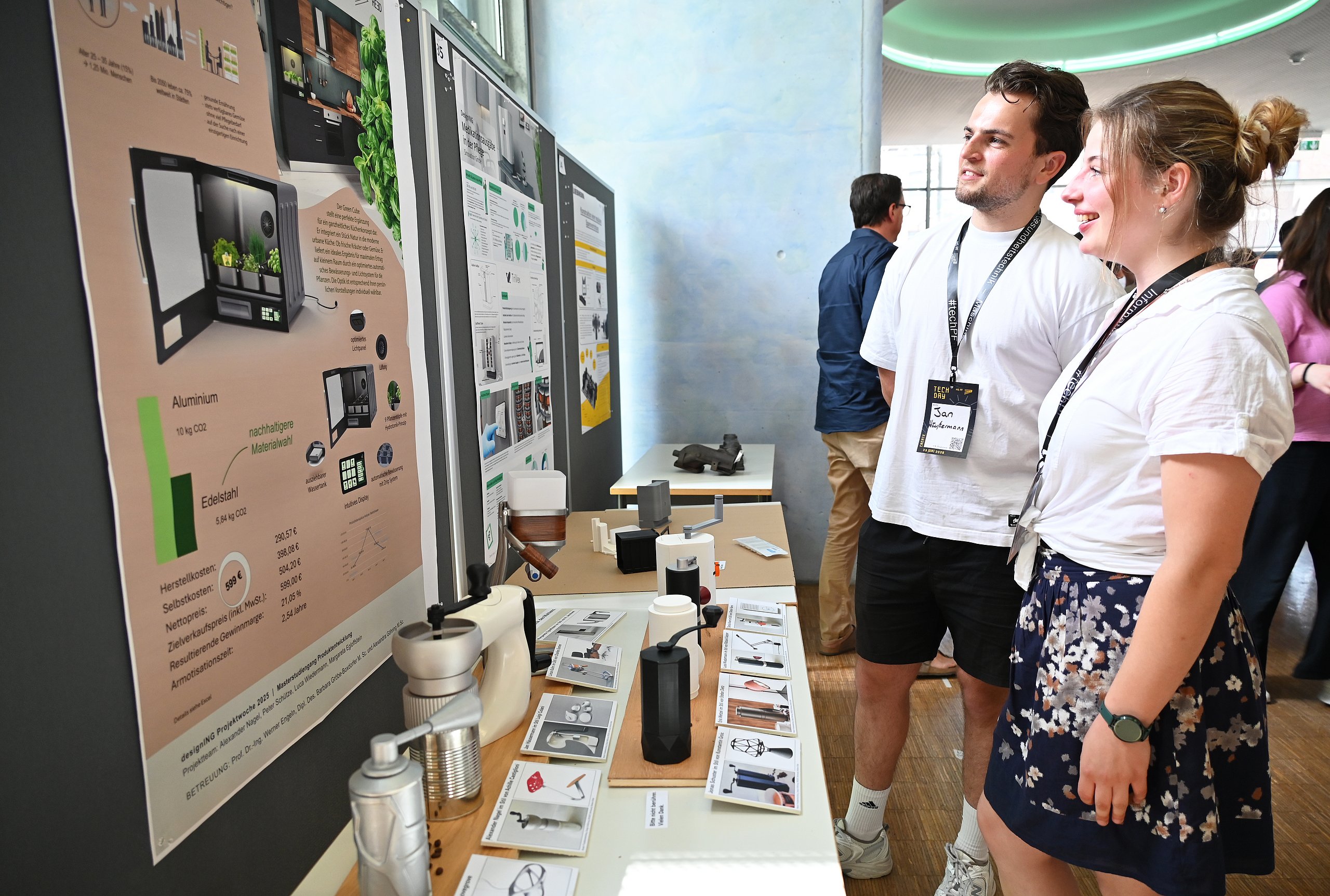 Prodekan Henning Hinderer und Professorin Viola Galler bewundern die Projekte der Studierenden.