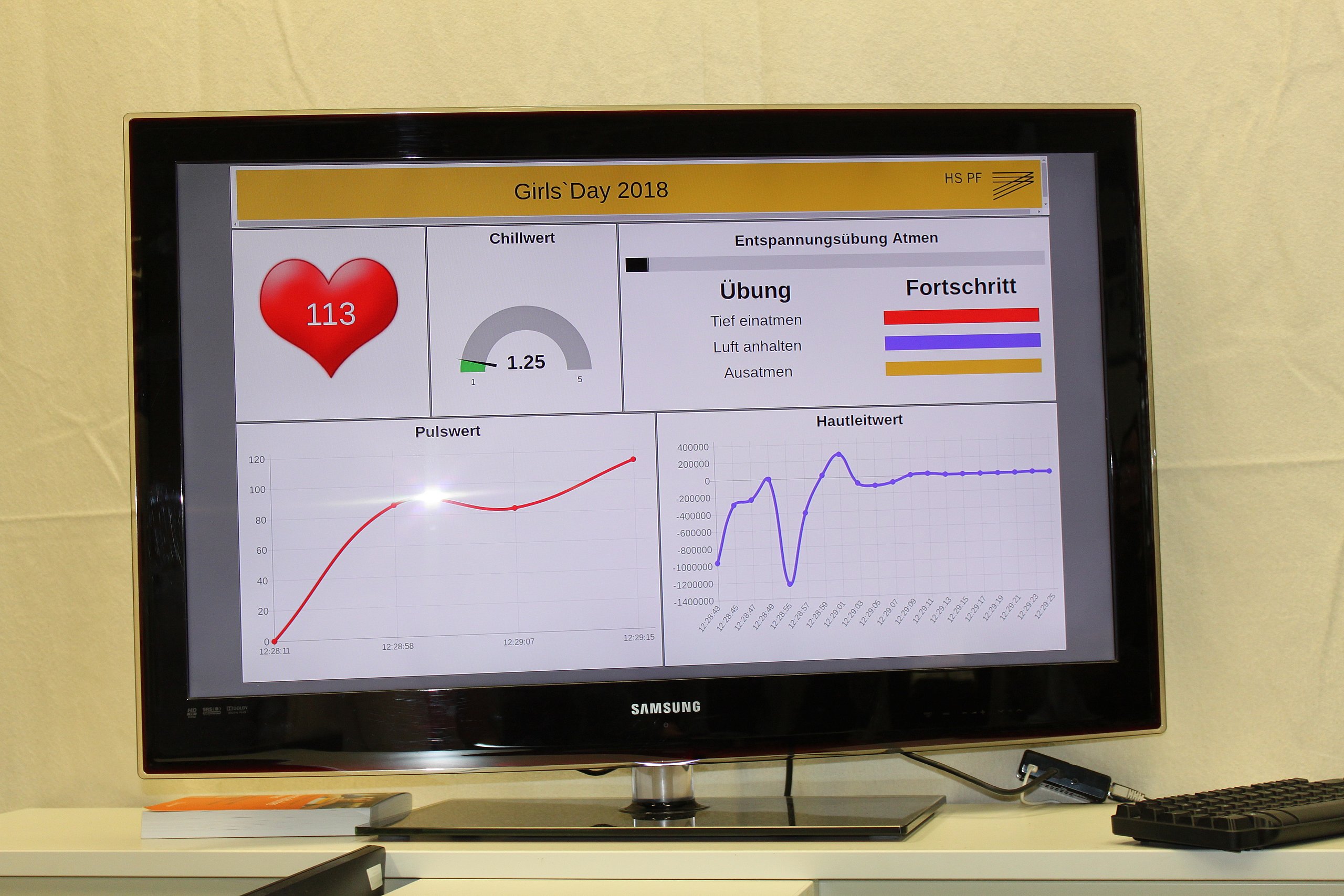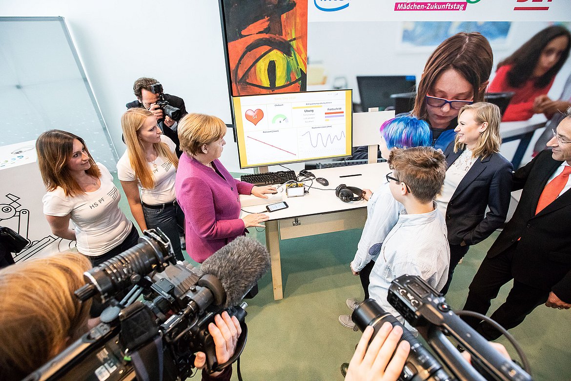 Die Bundeskanzlerin zur Entspannung einladen – diese Chance bot sich zwei Studentinnen der Fakultät für Technik der Hochschule Pforzheim. Im Rahmen des Girls‘ Day präsentierten Anna Bauer und Katrin Bott am 25. April 2018 im Berliner Bundeskanzleramt das Technik-Projekt „Biofeedback-Analyzer“ – vor Schülerinnen und Bundeskanzlerin Angela Merkel höchstpersönlich. Die Kanzlerin war eingeladen, den sogenannten "Chill-Contest" am Analysiergerät durchzuführen und dabei ihren Wert der inneren Ruhe anzeigen zu lassen.