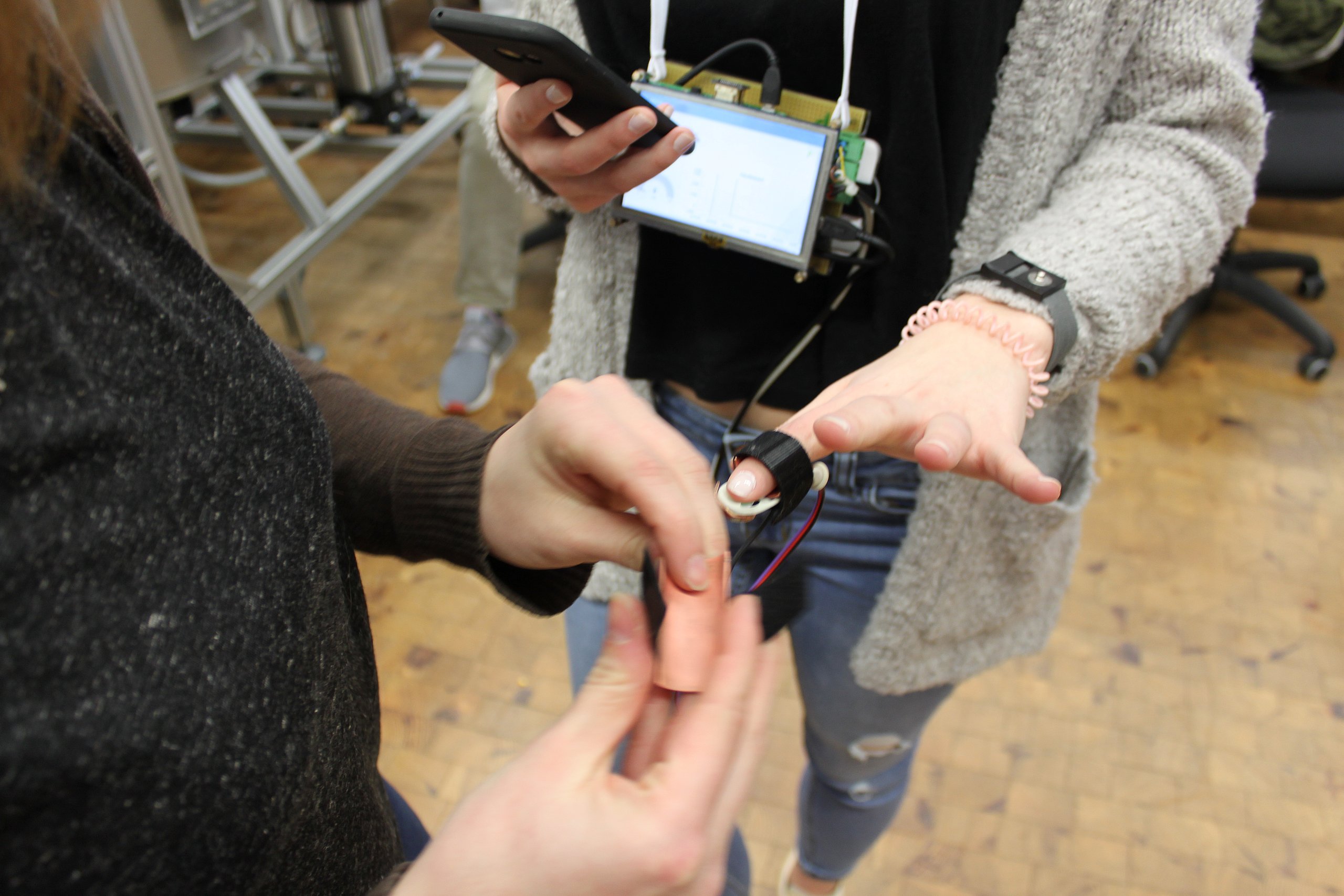 Drei Monate tüftelten Studierende verschiedener Fachrichtungen an einem Gerät, das nicht nur das Stresslevel des Körpers erfassen, sondern sogar zu maximaler Entspannung verhelfen kann. Über an den Fingerspitzen angebrachte Elektroden misst der selbstentwickelte Biofeedback-Analyzer Puls und Hautleitwert. Der jeweilige Gemütszustand wird nicht nur durch Displayanzeigen auf Smartphone oder Tablet visualisiert, sondern kann durch eine integrierte App sogar beeinflusst werden: eine von den Studentinnen selbst entwickelte mobile Anwendung spielt je nach Bedarf automatisch entspannende Lieder ab, blendet beruhigende Bilder ein oder liefert Beschreibungen zu Entspannungs- und Atemtechniken.