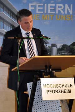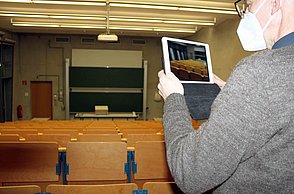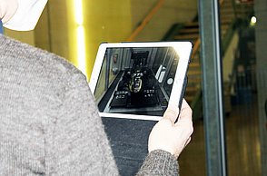 Mit dem Tablet über den Campus: Martin Pfeiffer nahm die Ehemaligen mit zu einem Rundgang durch die Gebäude T1 und T2 entlang der Tiefenbronner Straße in Pforzheim. Die Alumni erhielten so kurze Einblicke in vertraute Hörsäle von früher und für sie noch unbekannte zwischenzeitlich neu entstandene Raumangebote, wie das Leichtbaulabor im Bereich Maschinenbau oder das Analytiklabor im Bereich Medizintechnik.