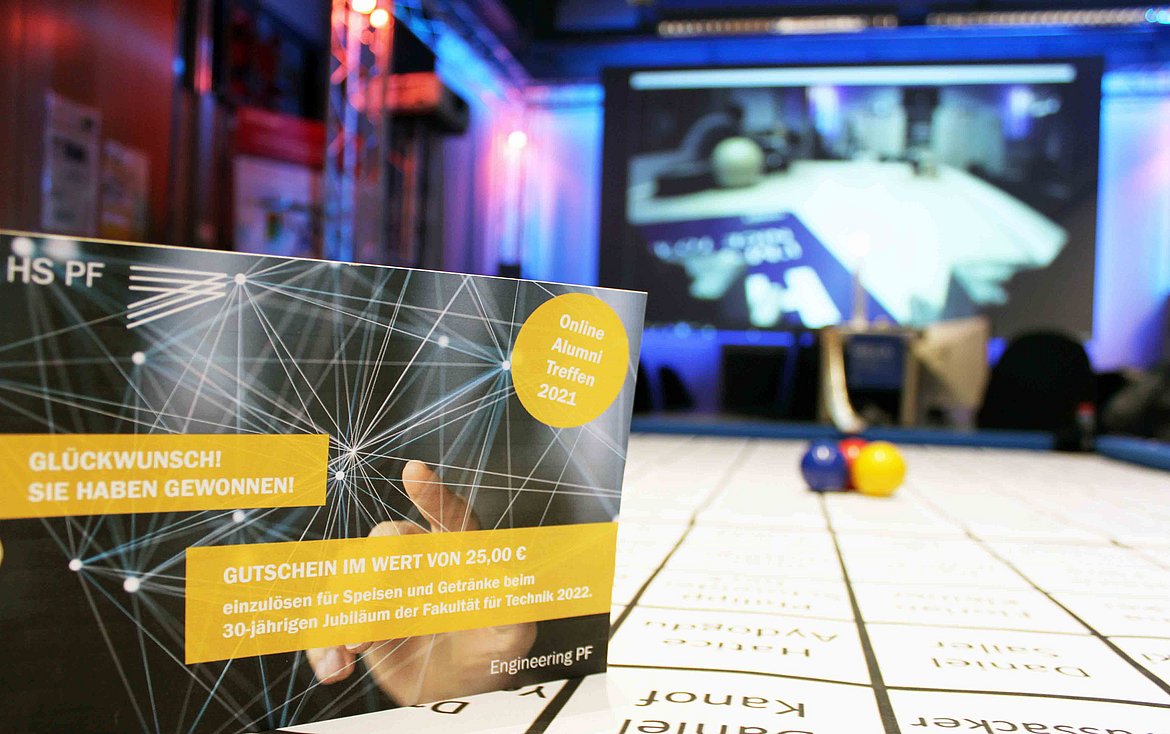 Als etwas andere Glücksfee war ein kleiner Roboter namens Vector im Einsatz. Im Mechatronik-Labor der Hochschule Pforzheim stieß er Billardkugeln in Gang, deren Haltepunkt auf dem Billardtisch nach dem Zufallsprinzip drei Gewinner bestimmte. Diese erhielten je einen Verzehrgutschein im Wert von 25 Euro, der bei der nächsten Alumni-Veranstaltung, die im Sommer 2022 in gewohnter Weise wieder auf dem Pforzheimer Campus stattfinden soll, eingelöst werden kann. „Wir denken positiv und gehen davon aus, dass wir, nachdem die entbehrungsreiche Zeit der Pandemie dann irgendwann endlich der Vergangenheit angehört, Sie in 2022 hier in Pforzheim, vor Ort, zu unserer dann umso größeren Nachhol-Veranstaltung mit Handschlag begrüßen dürfen“, so Matthias Weyer.
